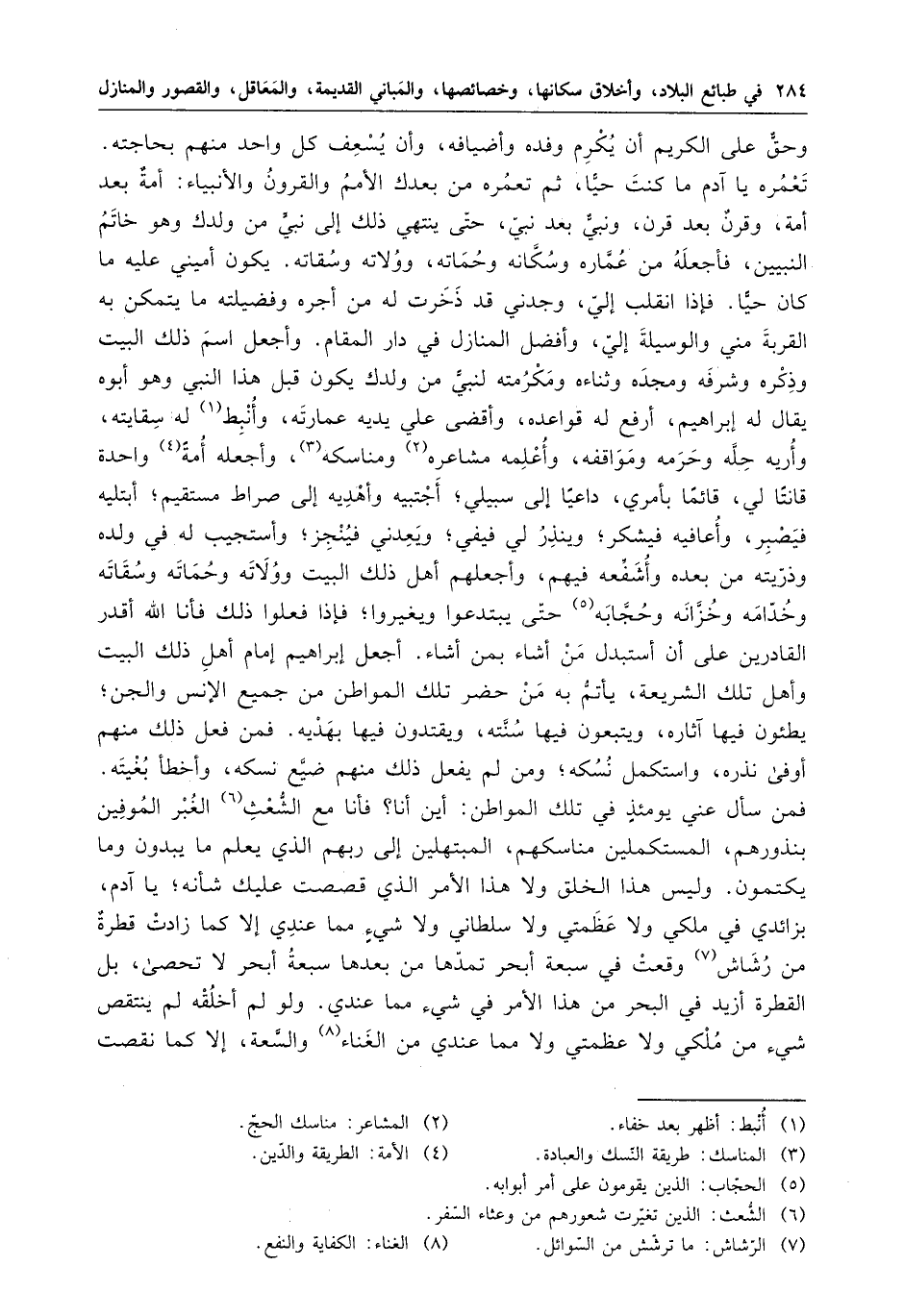 وحق على الكريم أن يكرم وفده وأضيافه ، وأن يسعف كل واحد منهم بحاجته . تعمره يا آدم ما كنت حيا ، ثم تعمره من بعدك الأمم والقرون والأنبياء : أمة بعد أمة ، وقرن بعد قرن ، ونبي بعد نبي ، حتى ينتهي ذلك إلى نبي من ولدك وهو خاتم النبين ، فأجعله من عماره وسكانه وحماته ، وولاته وسقاته . يكون أميني عليه ما كان حيا . فإذا انقلب إلي ، وجدني قد ذخرت له من أجره وفضيلته ما يتمكن به القربة مني والوسيلة إلي ، وأفضل المنازل في دار المقام . وأجعل اسم ذلك البيت وذكره وشرفه ومجده وثناءه ومكرمته لنبي من ولدك يكون قبل هذا النبي وهو أبوه يقال له إبراهيم ، أرفع له قواعده ، وأقضي على يديه عمارته ، وأنبط له سقايته ، وأريه حله وحرمه ومواقفه ، وأعلمه مشاعره ومناسكه ، وأجعله أمة واحدة قانتا لي ، قائما بأمري ، داعيا إلى سبيلي ؛ أجتبيه وأهديه إلى صراط مستقيم ؛ أبتليه فيصبر ، وأعافيه فيشكر ؛ وينذر لي فيفي ؛ ويعدني فينجز ؛ أستجيب له في ولده وذريته من بعده وأشفعه فيهم وأجعلهم أهل ذلك البيت وولاته وحماته وسقاته وخدامه وخزانه وحجابه حتى يبتدعوا ويغيروا ؛ فإذا فعلوا ذلك فأنا الله أقدر القادرين على أن أستبدل من أشاء بمن أشاء . أجعل إبراهيم إمام أهل ذلك البيت وأهل تلك الشريعة ، يأتم به من حضر تلك المواطن من جميع الأنس والجن ؛ يطئون فيها أثاره ، ويتبعون فيها سنته ، ويقتدرون فيها بهديه . فمن فعل ذلك منهم أوفى نذره ، واستكمل نسكه ؛ ومن لم يفعل ذلك منهم ضيع نسكه ، وأخطأ بغيته . فمن سأل عني يومئذ في تلك المواطن : أين أنا ؟ فأنا مع الشعث الغبر الموفين بنذورهم المستكملين مناسكهم ، المبتهلين إلى ربهم الذي يعلم ما يبدون وما يكتمون . وليس هذا الخلق ولا هذا الأرمر الذي قصصت عليك شأنه ؛ يا آدم ، بزائدي في ملكي ولا عظمتي ولا سلطاني ولا شيء مما عندي إلا كما زادت قطرة من رشاش وقعت في سبعة أبحر تمدها من بعدها سبعة أبحر لا تحصى ، بل القطرة أزيد في البحر من هذا الأمر في شيء مما عندي . ولو لم أخلقه لم ينتقص شيء من ملكي ولا عظمتي ولا مما عندي من الغناء والسعة ، إلا كما نقصت