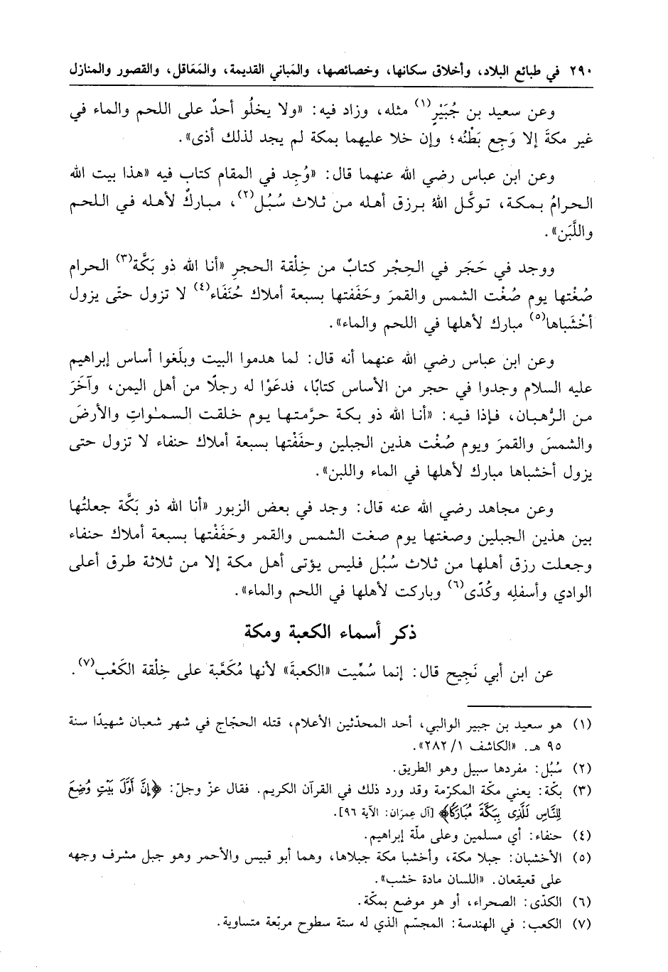 وعن مجاهد رضي الله عنه قال : وجد في بعض الزبور أما الله ذو بكة جعلتها بين هذين الجبلين وصغتها يوم صغت الشمس والقمر وحففتها بسبعة أملاك حنفاء وجعلت رزق أهلها من ثلاث سبل فليس يوتا أهل مكة إلا من ثلاثة طرق أعلى الوادي وأسفله وكدى وباركت لأهلها في اللحم والماء .