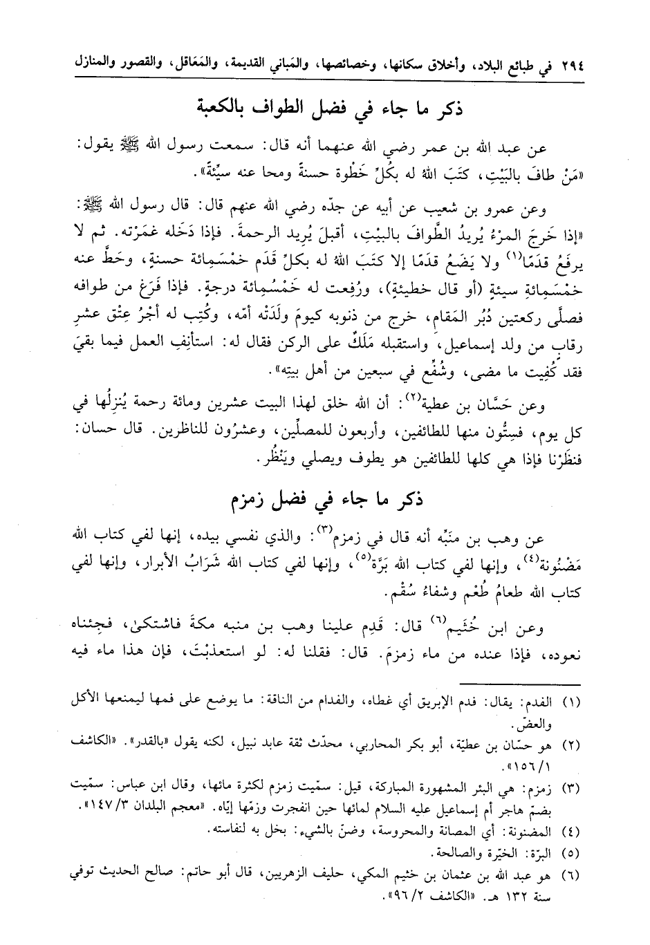 عن وهب بن منبه أنه قال في زمزم : والذي نفسي بيده ، إنها لفي كتاب الله مضنونة ، وإنها لفي كتاب الله برة ، وإنها لفي كتاب الله شراب الأبرار ، وإنها لفي كتاب الله طعام طعم وشفاء سقم .