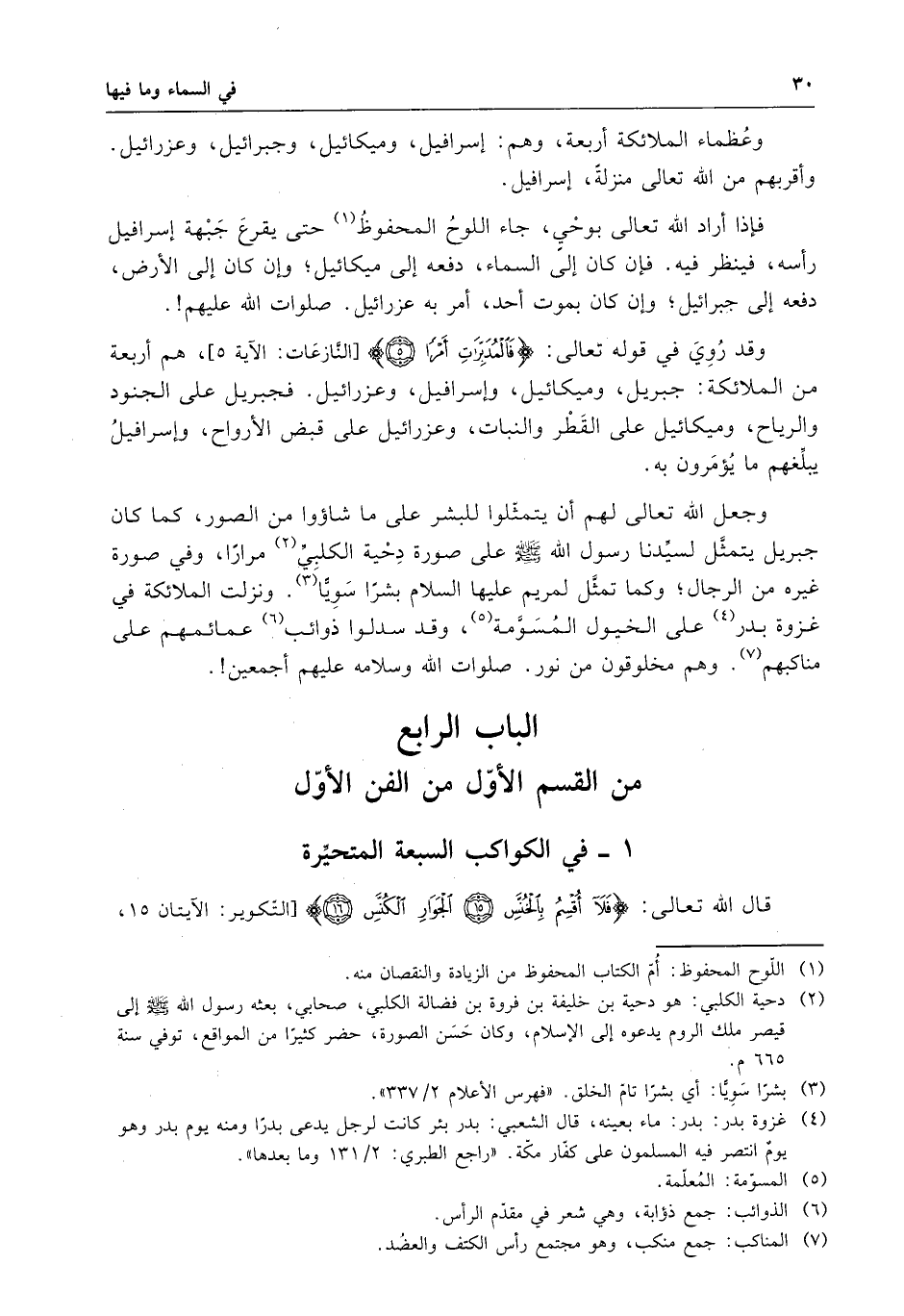 وجعل الله تعالى لهم أن يتمثلوا للبشر على ما شاءوا من الصور ، كما كان جبريل يتمثل لسيدنا رسول الله ( صلى الله عليه وسلم ) على صورة دحية الكلبى مرارا ، وفي صورة غيره من الرجال ؛ وكما تمثل لمريم عليها السلام بشر سوياً . ونزلت الملائكة في غزوة بدر على الخيول المسومة ، وقد سدلوا ذوائب عمائمهم على مناكبهم . وهم مخلوقون من نور . صلوات الله وسلامه عليهم أجمعين