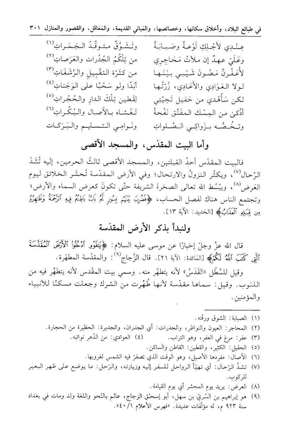 فالبيت المقدس أحد القبلتين ، والمسجد الأقصى ثالث الحرمين . إليه تشد الرجال ، ويكثر النزول والارتحال ؛ وفي الأرض المقدسة تحشر الخلائق يوم العرض ، ويبسط الله تعالى الصخرة الشريفة حتى تكون كعرض السماء والأرض ؛ وتجتمع الناس هناك لفصل الحساب ، ويضرب بينهم بسور له باب ، باطنة فيه الرحمة وظاهرة من قبله العذاب .