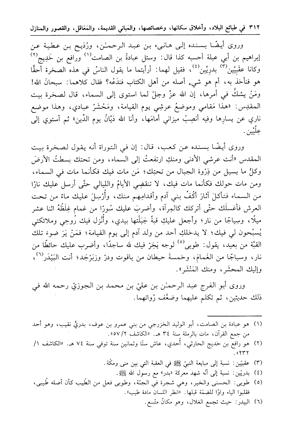 وروي أيضا بسنده إلى هانئ بن عبد الرحمن ، ورديح بن عطية عن إبراهيم ابن أبي عبلة أحسبه كذا قال : وسئل عبادة بن الصامت ورافع بن خديج وكانا عقبيين بدريين ، فقيل لهما : أرأيتما ما يقول الناس في هذه الصخرة أحقاً هو فنأخذ به ، أم هو شيء أصله من أهل الكتاب فندعه ؟ فقال كلاهما : سبحان الله ومن يشك في أمرها ، إن الله عز وجل لما استوى إلى السماء ، قال لصخرة بيت المقدس : " هذا مقامي وموضع عرشي يوم القيامة ، ومحشر عبادي ، وهذا موضع ناري عن يسارها وفيه وأنصب ميزاني أمامها ، وأنا الله ديان يوم الدين " ثم استوى إلى عليين . وروي أيضا بسنده عن كعب ، قال : إن في التوراة أنه يقول لصخرة بيت المقدس " أنت عرشي الأدنى ومنك ارتفعت إلى السماء ، ومن تحتك بسطت الأرض وكل ما يسيل من ذروة الجبال من تحتك ؛ من مات فيك فكأنما مات في السماء ، ومن مات حولك فكأنما مات فيك ، لا تنقضي الأيام والليالي حتى أرسل عليك نارا من السماء فتأكل آثارا أكف بني آدم وأقدامهم منك ، وأرسل عليك ماء من تحت العرش فأغسلك حتى أتركك كالمرآة ، وأضرب عليك سورا من غمام غلظه اثنا عشر ميلا ، وسياجا من نار ؛ وأجعل عليك قبة جبلتها بيدي ، وأنزل فيك روحي وملائكتي يسبحون لي فيك ؛ لا يدخلك أحد من ولد لآدم إلى يوم القيامة ؛ فمن بر ضوء تلك القبة من بعيد ، يقول : طوبى لوجه يخر فيك لله ساجدا ، وأضرب عليك حائطا من نار وسياجا من الغمام ، وخمسة حيطان من ياقوت ودرر وزبر جد ؛ أنت البيدر ، وإليك المحشر ، ومنك المنشر " وروى أبو الفرج عبد الرحمن بن علي بن محمد بن الجوزي رحمه الله في ذلك حديثين ، ثم تكلم عليهما وضعف رواتهما .