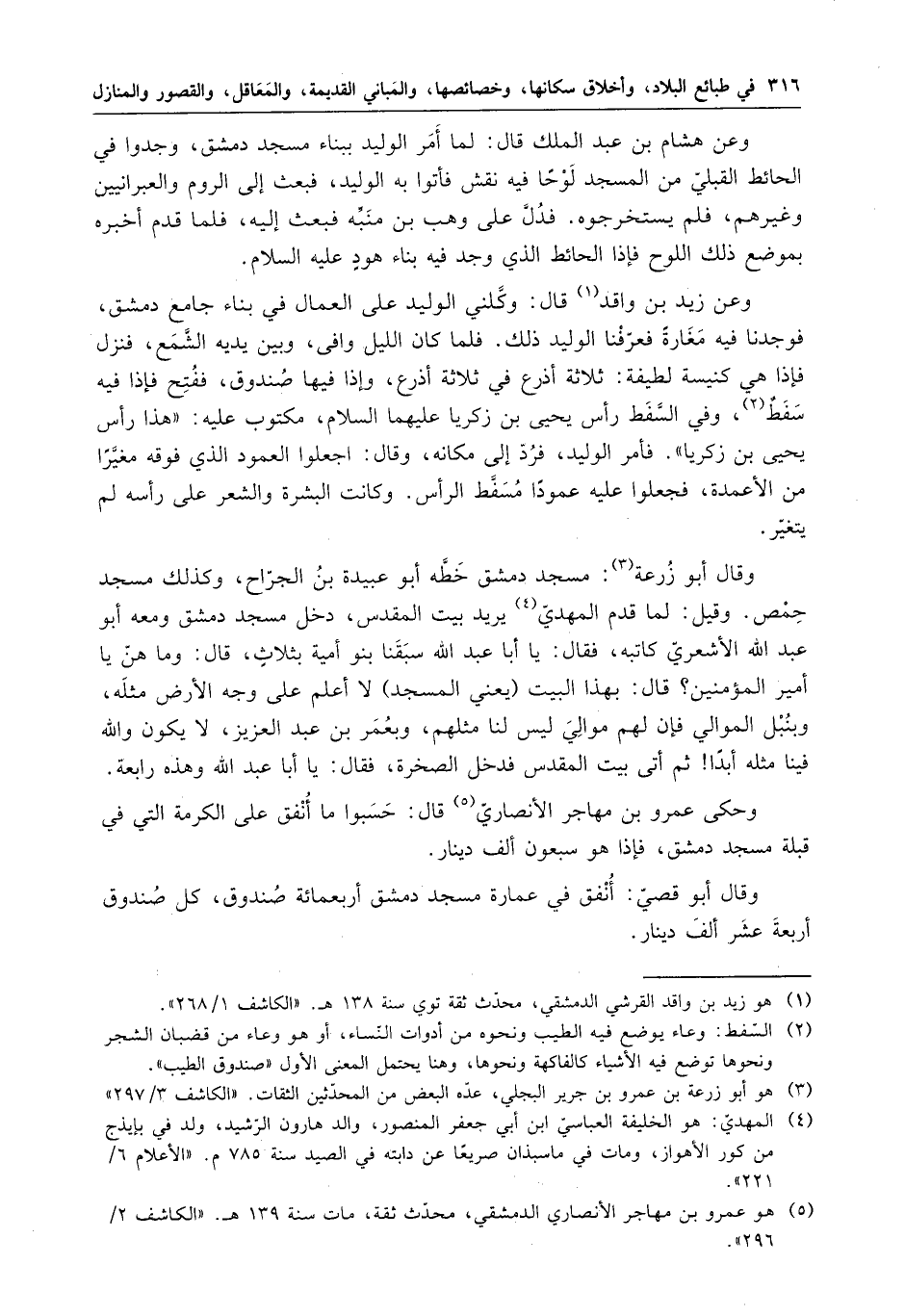 وقال أبو زرعة : مسجد دمشق خطه أبو عبيد بن الجراح ، وكذلك مسجد حمص . وقيل : لما قدم المهدي يريد بيت المقدس ، دخل مسجد دمشق ومعه أبو عبد الله الأشعري كاتبه ، فقال : يا أبا عبد الله سبقنا بنو أمية بثلاث ، قال : وما هن يا أمير المؤمنين ؟ قال : بهذا البيت " يعني المسجد " لا أعلم على وجه الأرض مثله ، وبنبل الموالي فإن ليس لنا مثلهم ، وبعمر بن عبد العزيز ، لا يكون فينا مثله أبدت ثم أتى بيت المقدس فدخل الصخرة ، فقال : يا أبا عبد الله وهذه رابعة .