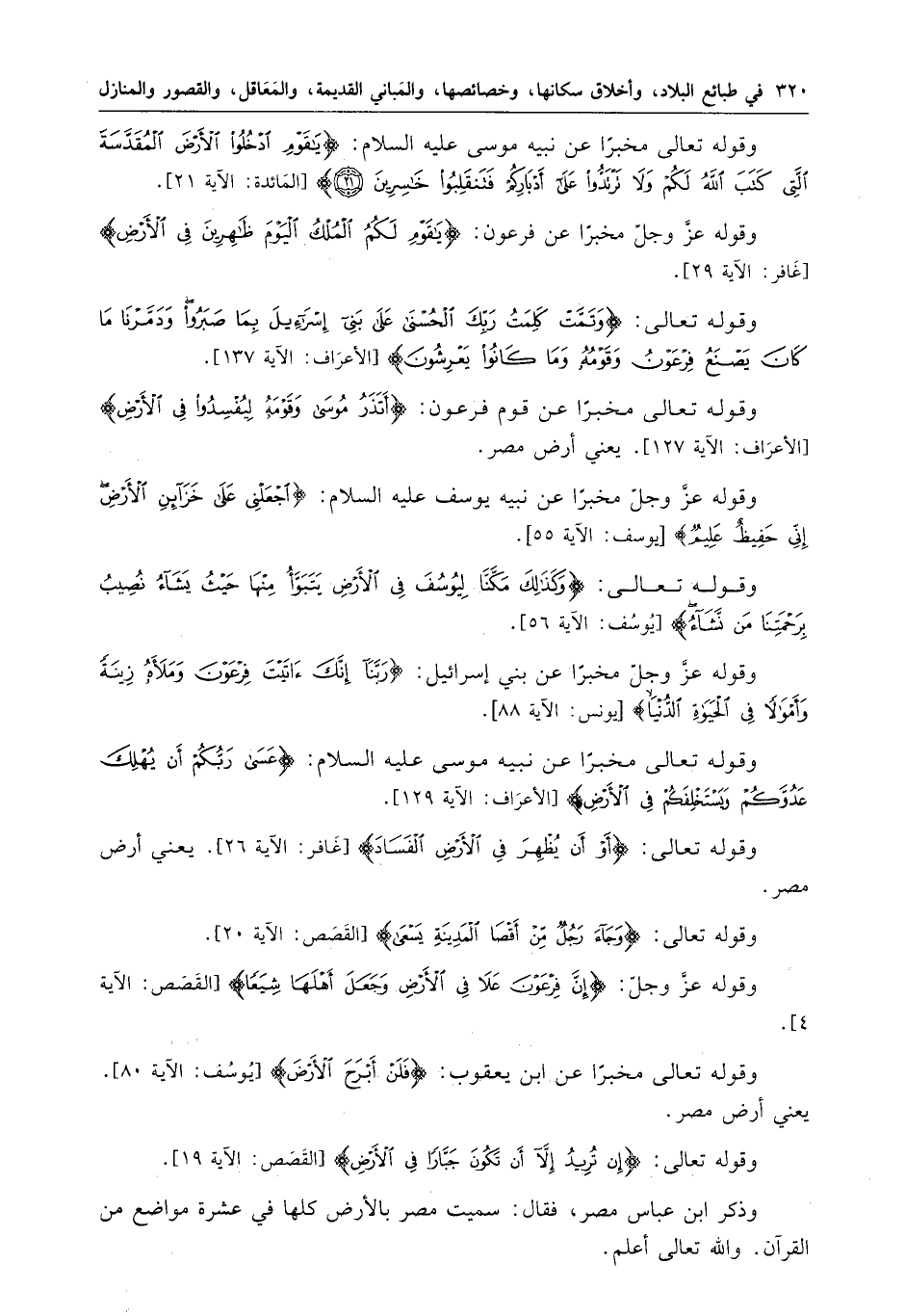 وذكر ابن عباس مصر ، فقال : سميت مصر بالأرض كلها في عشرة مواضع من القرآن . والله أعلم .