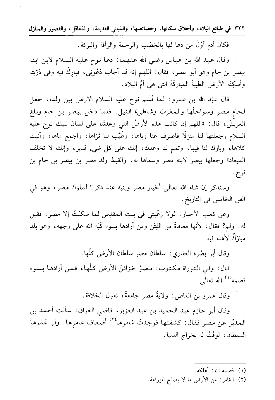 قال عبد الله بن عمرو : لما قسم نوح عليه السلام الأرض بين ولده ، جعل لحام مصر وسواحلها والمغرب وشاطئ النيل . فلما دخل بيصر بن حام وبلغ العريش ، قال : " اللهم إن كانت هذه الأرض التي وعدتنا على لسان نبيك نوح عليه السلام وجعلتها لنا منزلا فاصرف عنا وباها ، وطيب لنا ثراها ، واجمع ماها ، وأنبت كلاها ، وبارك لنا فيها ، وتمم لنا وعدك ، إنك على كل شيء قدير ، وإنك لا تخلف الميعاد " وجعلها بيصر لابنه مصر وسماها به . والقبط ولد مصر بن بيصر بن حام بن نوح .