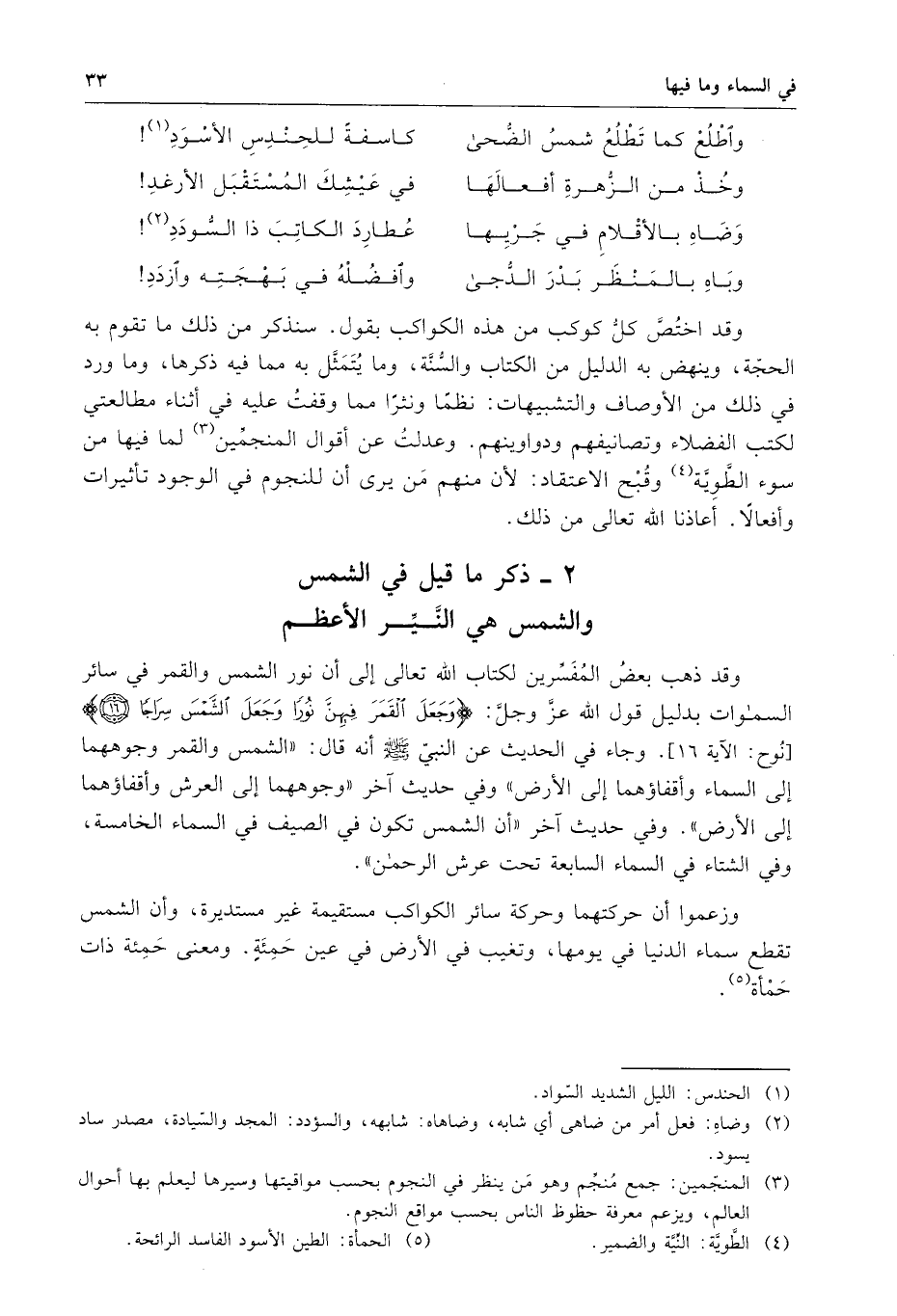 وقد اختص كل كوكب من هذه الكواكب بقول . سنذكر من ذلك ما تقوم به الحجة ، وينهض به الدليل من الكتاب والسنة ، وما يتمثل به مما فيه ذكرها ، وما ورد في ذلك من الأوصاف والتشبيهات : نظماً ونثراً مما وقفت عليه في أثناء مطالعتي لكتب الفضلاء وتصانيفهم ودواوينهم . وعدلت عن أقوال المنجمين لما فيها من سوء الطوية وقبح الإعتقاد : لأن منهم من يرى أن للنجوم في الوجود تأثيرات وأفعالاً . أعاذنا الله تعالى من ذلك