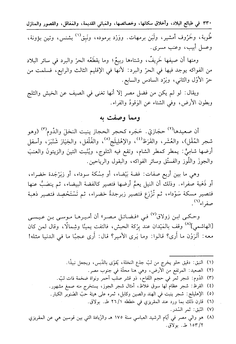 أن صعيدها حجازي . حجره كحجر الحجاز ينبت النخل والدوم " وهو شجر المقل " ، والعشر ، والقرظ ، والإهليلج ، والفلفل ، والخيار شنبر . وأسفل أرضها شامي : يمطر كمطر الشام ، وتقع فيه الثلوج ، وينبت التين والزيتون والعنب والجوز واللوز والفستق وسائر الفواكه ، والبقول والرياحين وهي ما بين أربع صفات : فضة بيضاء ، أو مسكة سوداء ، أو زبرجدة خضراء ، أو ذهبة صفراء . وذلك أن النيل يعم أرضها فتصير كالفضة البيضاء ، ثم ينصب عنها فتصير مسكة سوداء ، ثم تزرع فتصير برجدة خضراء ، ثم تستحصد فتصير ذهبة صفراء .