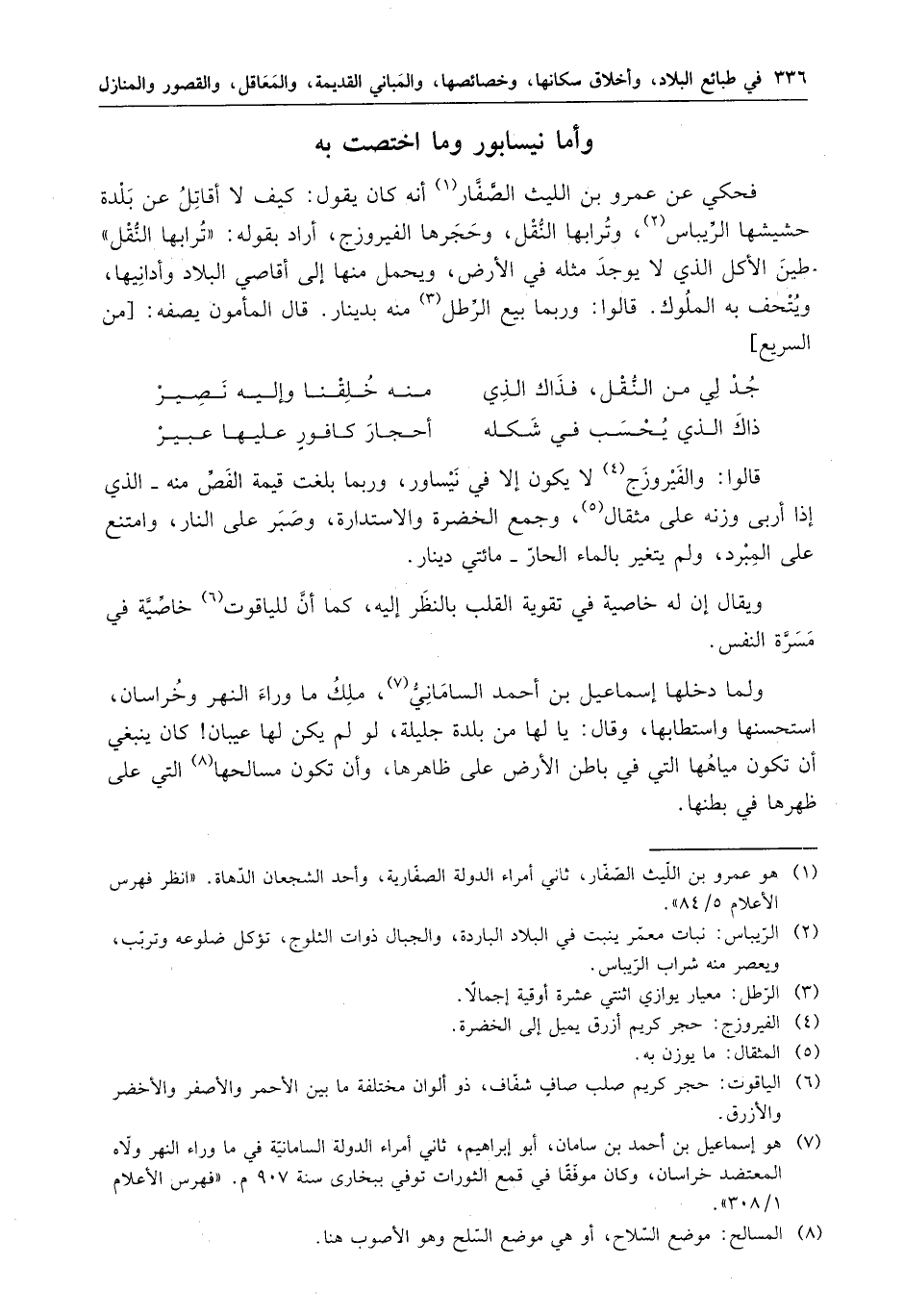 فحكي عن عمرو بن الليث الصفار أنه كان يقول : كيف لا أقاتل عن بلدة حشيشها الريباس ، وترابها النقل ، وحجرها الفيروزج . أراد بقوله : ترابها النقل طين الأكل الذي لا يوجد مثله في الأرض ، ويحمل منها إلى أقاصي البلاد وأدانيها ، ويتحف به الملوك . قالوا : وربما بيع الرطل منه بدينار . قال المأمون يصفه :