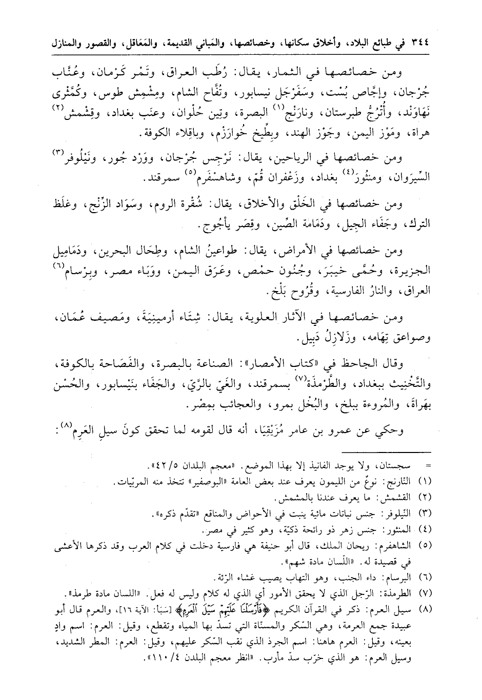 ومن خصائصها في الخلق والأخلاق ، ويقال : شقرة الروم ، وسواد الزنج ، وغلظ الترك ، وجفاء الجيل ، ودمامة الصين ، قصر يأجوج . ومن خصائصها في الأمراض ، يقال : طواعين الشام ، وطحال البحرين ، ودماميل الجزيرة ، وجنون حمص ، وعرق اليمن ، ووباء مصر ، وبرسام العراق ، والنار الفارسية ، وقروح بلخ .