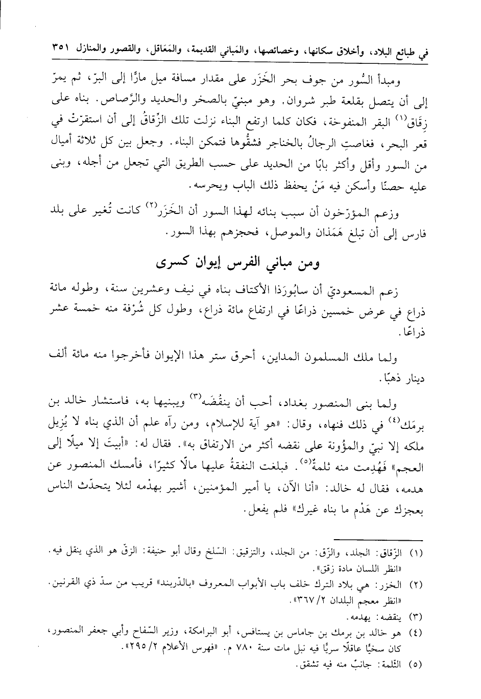 ولما بنى المنصور بغداد أحب أن ينقضه ويبنيها به ، فاستشار خالد بن برمك في ذلك فنهاه ، وقال : هو آية للإسلام ، ومن رآه علم أن الذي بناه لا يزيل ملكه إلا نبي والمؤون على نقضه اكثر من الارتفاق به . فقال له : أبيت إلا ميلا إلى العجم فهدمت منه ثلمة . فبلغت النفق عليها مالا كثيرا ، فأمسك المنصور عن هدمه ، فقال له خالد : أنا الآن ، يا أمير المؤمنين ، أشير بهدمه لئلا يتحدث الناس بعجزك عن هدم ما بناه غيرك فلم يفعل .