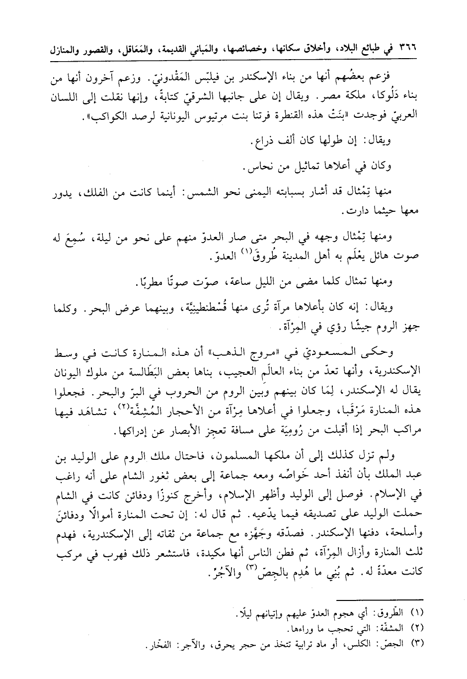 وحكى المسعودي في مروج الذهب أن هذه المنارة كانت في وسط الإسكندرية ، وأنها تعد من بناء العالم العجيب ، بناها بعض البطالسة من ملوك اليونان يقال له الإسكندر ، لما كان بينهم وبين الروم من الحروب في البر والبحر فجعلوا هذه المنارة مرقبا ، وجعلوا في أعلاها مرآة من الأحجار المشفة ، تشاهد فيها مراكب البحر إذا أقبلت من رومية على مسافة تعجز الأبصار عن إدراكها . ولم تزل كذلك إلى أن ملكها المسلمون ، فاحتال ملك الروم على الوليد بن عبد الملك بأن أنفذ أحد خواصه ومعه جماعة إلى بعض ثغور الشام على أنه راغب في الإسلام . فوصل إلى الوليد ، وأخرج كنوزاً ودفائن كانت في الشام حملت الوليد على تصديقه فيما يدعيه . ثم قال له : إن تحت المنارة أموالا ودفائن وأسلحة ، دفنها الإسكندر فصدقه وجهزه مع جماعة من ثقاته إلى الإسكندرية ، فهدم ثلث المنارة وأزال المرآة ، ثم فطن الناس أنها مكيدة ، فاستشعرذلك فهرب في مركب كانت معدة له . ثم بنى ما هدم بالجص والآجر .