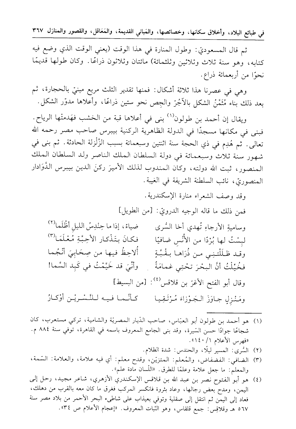 ثم قال المسعودي : وطول المنارة في هذا الوقت " يعني الوقت الذي وضع فيه كتابه ، وهو سنة ثلاث وثلاثين وثلاثمائة " مائتان وثلاثون ذراعا . وكان طولها قديما نحو من أربعمائة ذراع .