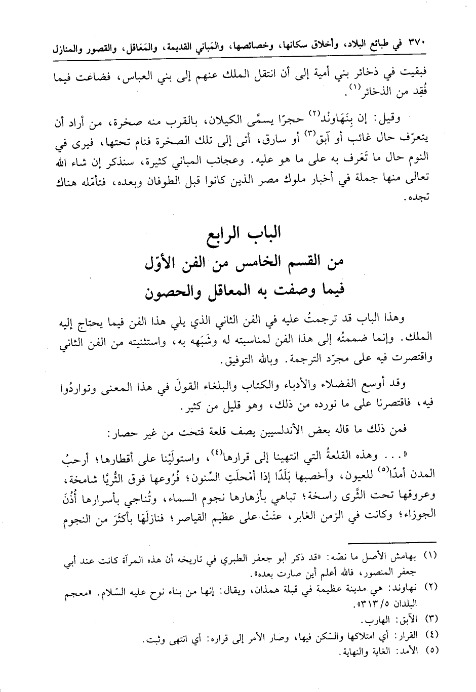 الباب الرابع من القسم الخامس من الفن الأول " فيما وصفت به المعاقل والحصون "