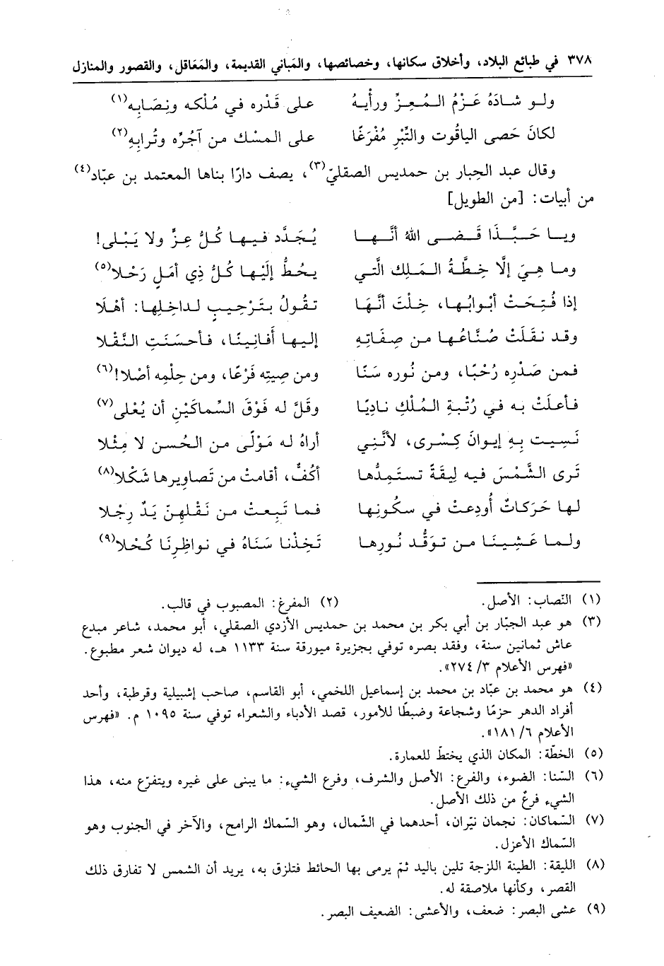 وقال عبد الجبار بن حمديس الصقلي ، يصف داراً بناها المعتمد بن عباد من أبيات :