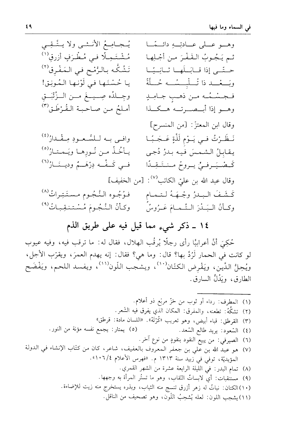 حكى أن أعرابياً رأى رجلاً يرقب الهلال . فقال له : ما ترقب فيه ، وفيه عيوب لو كانت في الحمار لرد بها ؟ قال : وما هي ؟ فقال : إنه يهدم العمر ، ويقرب الأجل ، ويحل الدين ، ويقرض الكتان ، ويشحب اللون ، ويفسد اللحم ، ويفضح الطارق ، ويدل السارق .