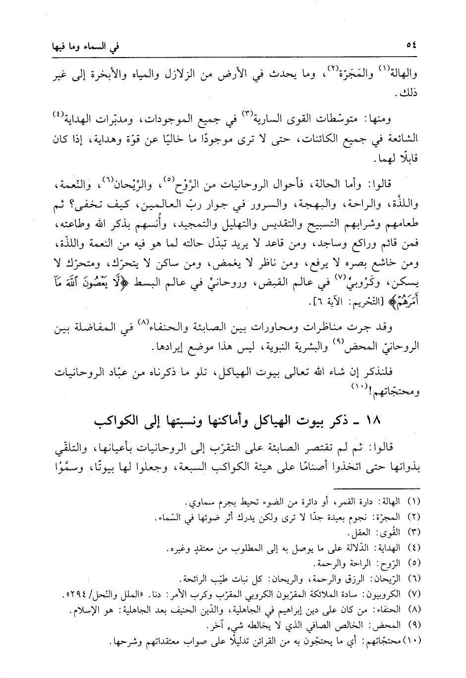 وقد جرت مناظرات ومحاورات بين الصابئة والحنفاء في المفاصلة بين الروحاني المحض والبشرية النبوية ، ليس هذا موضع إيرادها .
