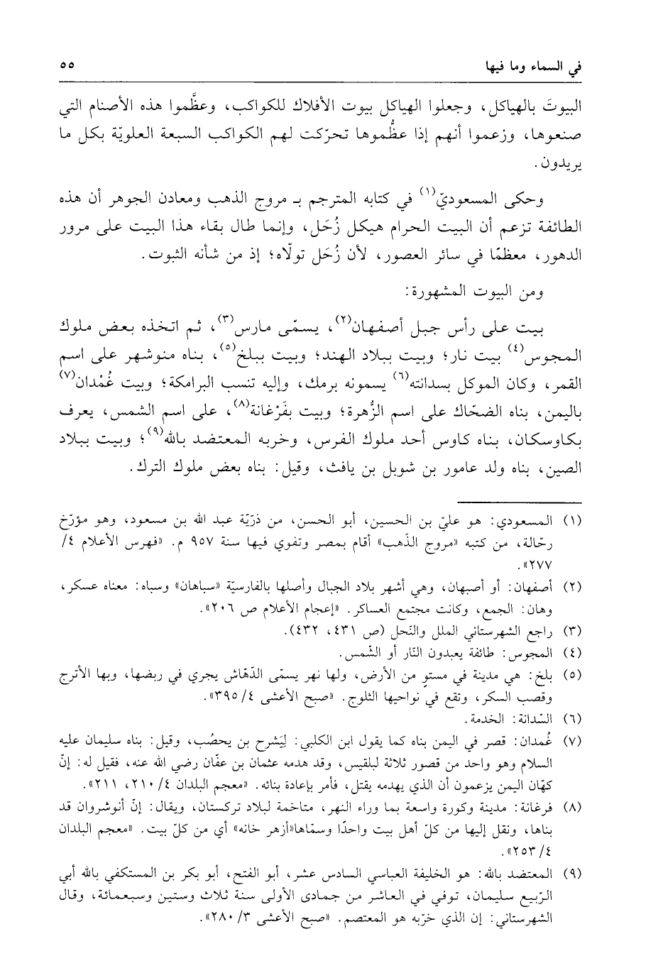 ومن البيوت المشهورة : بيت على رأس جبل أصفهان ، ويسمى مارس ، ثم اتخذه بعض ملوك المجوس بيت نار ؛ وبيت ببلاد الهند ، وبيت ببلخ ، بناه منو شهر على اسم القمر ، وكان الموكل بسدانته يسمونه برمك ، وإليه تنسب البرامكة ؛ وبيت غمدان باليمن ، بناه الضحاك على اسم الزهرة ؛ وبيت بفرغانة ، على اسم الشمس ، يعرف بكاوسان ، بناه كاوس أحد ملوك الفرس ، وخربه المعتضد بالله ؛ وبيت ببلاد الصين ، بناه ولد عامور بن شوبل بن يافث ، وقيل بناه ملوك الترك .