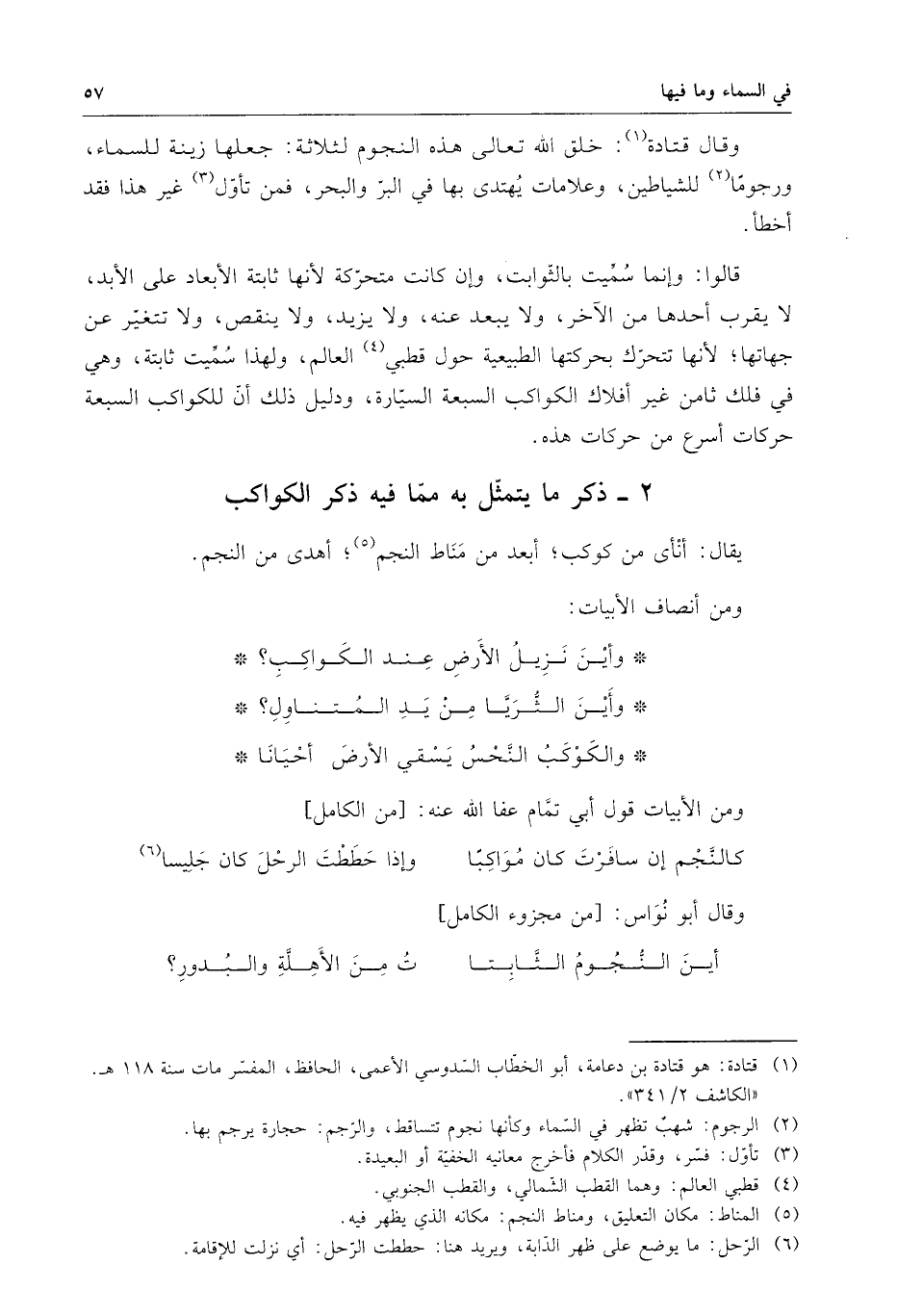 وقال قتادة : خلق الله تعالى هذه النجوم لثلاثة : جعلها زينة للسماء ، ورجوما للشياطين ، وعلامات يهتدى بها في البر والبحر . فمن تأول غير هذا فقد أخطأ .