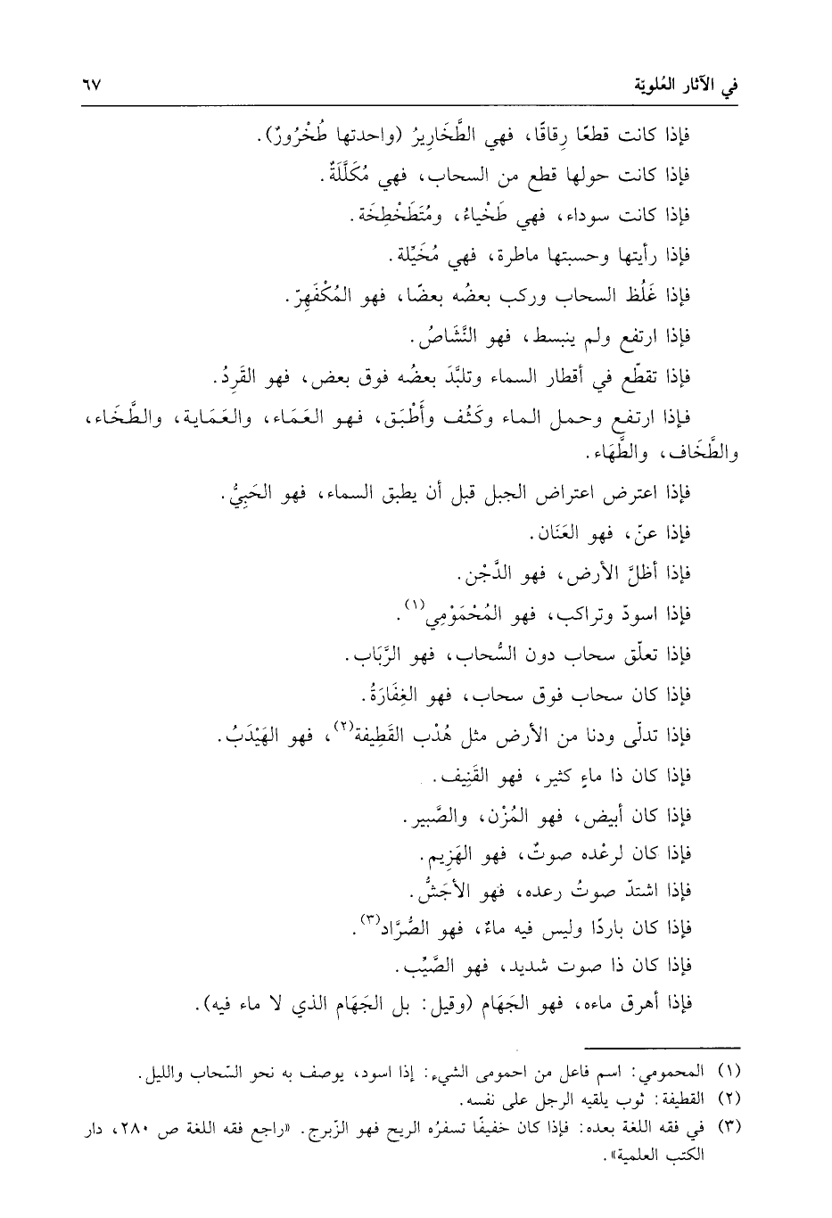 فإذا كانت قطعا رقاقا ، فهي الطخاريرُ " واحدتها طخرورٌ " فإذا كانت حولها قطع من السحاب ، فهي مكللةٌ .