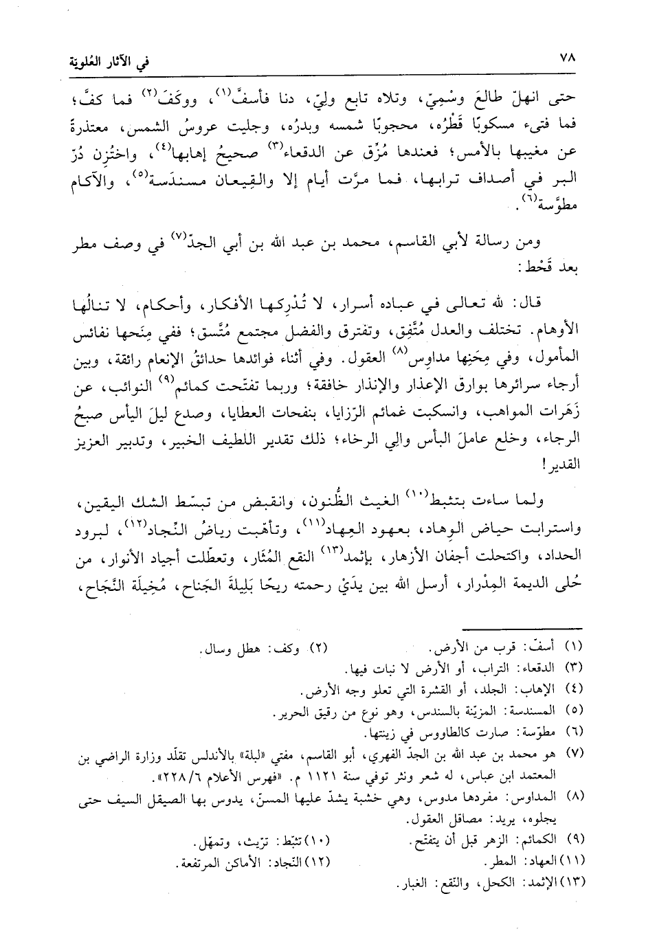 ومن رسالة لأبي القاسم ، محمد بن عبد الله بن أبي الجد في وصف مطر بعد قحط : قال : لله تعالى في عباده أسرار ، لا تدركها الأفكار ، وأحكام ، لا تنالها الأوهام . تختلف والعدل متفق ، وتفترق والفضل مجتمع متسق . ففي منحها نفائس المأمول ، وفي محنها مداوس العقول . وفي أثناء فوائدها حدائق الإنعام رائقه ، وبين أرجاء سرائرها بوارق الإعذار والإنذار خافقه . وربما تفتحت كمائم النوائب ، عن زهرات المواهب . وانسكبت غمائم الرزايا ، بنفحات العطايا . وصدع ليل اليأس صبح الرجاء ، وخلع عامل البأس وإلى الرخاء . ذلك تقدير اللطيف الخبير ، وتدبير العزيز القدير ولما ساءت بتثبط الغيث الظنون ، وانقبض من تبسط الشك اليقين ، واسترابت حياض الوهاد ، بعهود العهاد ، وتأهبت رياض النجاد ، لبرود الحداد ، واكتحلت أجفان الأزهار ، بإثمد النقع المثار ، وتعطلت أجياد الأنوار ، من حلى الديمة المدرار ، أرسل الله بين يدي رحمته ريحا بليلة الجناح ، مخيلة النجاح ،