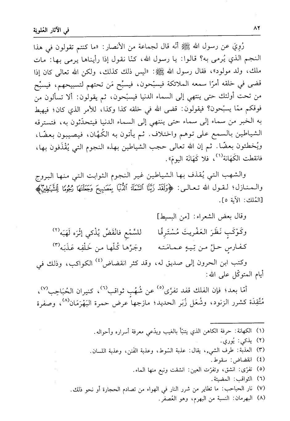 روي عن رسول الله ( صلى الله عليه وسلم ) أنه قال لجماعة من الأنصار : ما كنتم تقولون في هذا النجم الذي يرمى به ؟ قالوا : يا رسول الله ، كنا نقول إذا رأيناها يرمى بها : مات ملك ، ولد مولود ، فقال رسول الله ( صلى الله عليه وسلم ) : ليس ذلك كذلك ، ولكن الله تعالى كان إذا قضي في خلقه أمر اسمعه الملائكة فيسبحون ، فيسبح من تحتهم لتسبيحهم ، فيسبح من تحت أولئك حتى ينتهي إلى السماء الدنيا فيسبحون ، ثم يقولون ألا تسألون من فوقكم مم يسبحون ؛ فيقولون قضى الله في خلقه كذا وكذا ، للأمر الذي كان . فيهبط به الخبر من سماء إلى سماء حتى ينتهي إلى السماء الدنيا فيتحدثون به ، فتسترقه الشياطين بالسمع على توهم واختلاف . ثم يأتون به الكهان ، فيصيبون بعضا ، ويخطئون بعضا . ثم أن الله تعالى حجب الشياطين بهذه النجوم التي يقذفون بها فانقطعت الكهانة ، فلا كهانة اليوم .