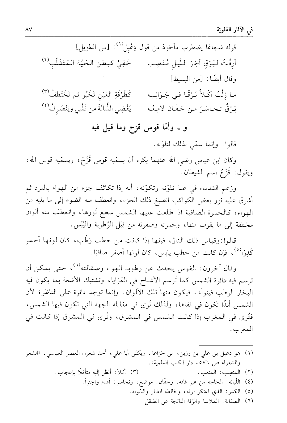 وقال آخرون : القوس يحدث عن رطوبة الهواء وصقالته ، حتى يمكن أن ترسم فيه دائرة الشمس كما ترسم الأشباح في المرايا ، وتشتبك الأشعة بما يكون فيه البخار الرطب فيتولد ، فيكون منها تلك الألوان . وإنما توجد دائرة على الناظر ، لأن الشمس أبداً تكون في قفاها ، ولذلك ترى في مقابلة الجهة التي تكون فيها الشمس ، فترى في المغرب إذا كانت الشمس في المشرق ، وترى في المشرق إذا كانت في المغرب .