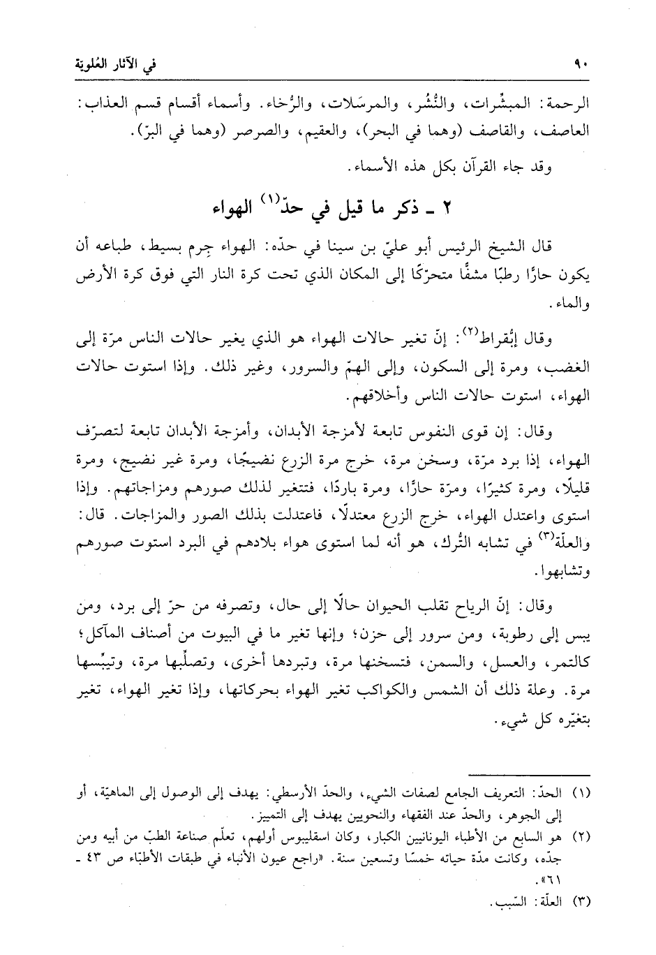قال الشيخ الرئيس أبو على بن سينا في حدّه : الهواء حرم بسيط ، طباعه أن يكون حاراً رطباً مشفا متحركاً إلى المكان الذي تحت كرة النار التي فوق كرة الأرض والماء .