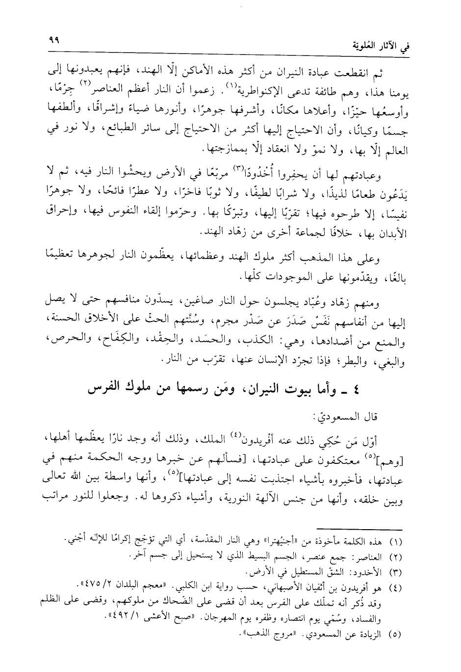 وعلى هذا المذهب أكثر ملوك الهند وعظمائها . يعظمون النار لجوهرها تعظيماً بالغاً ، ويقدمونها على الموجودات كلها .
