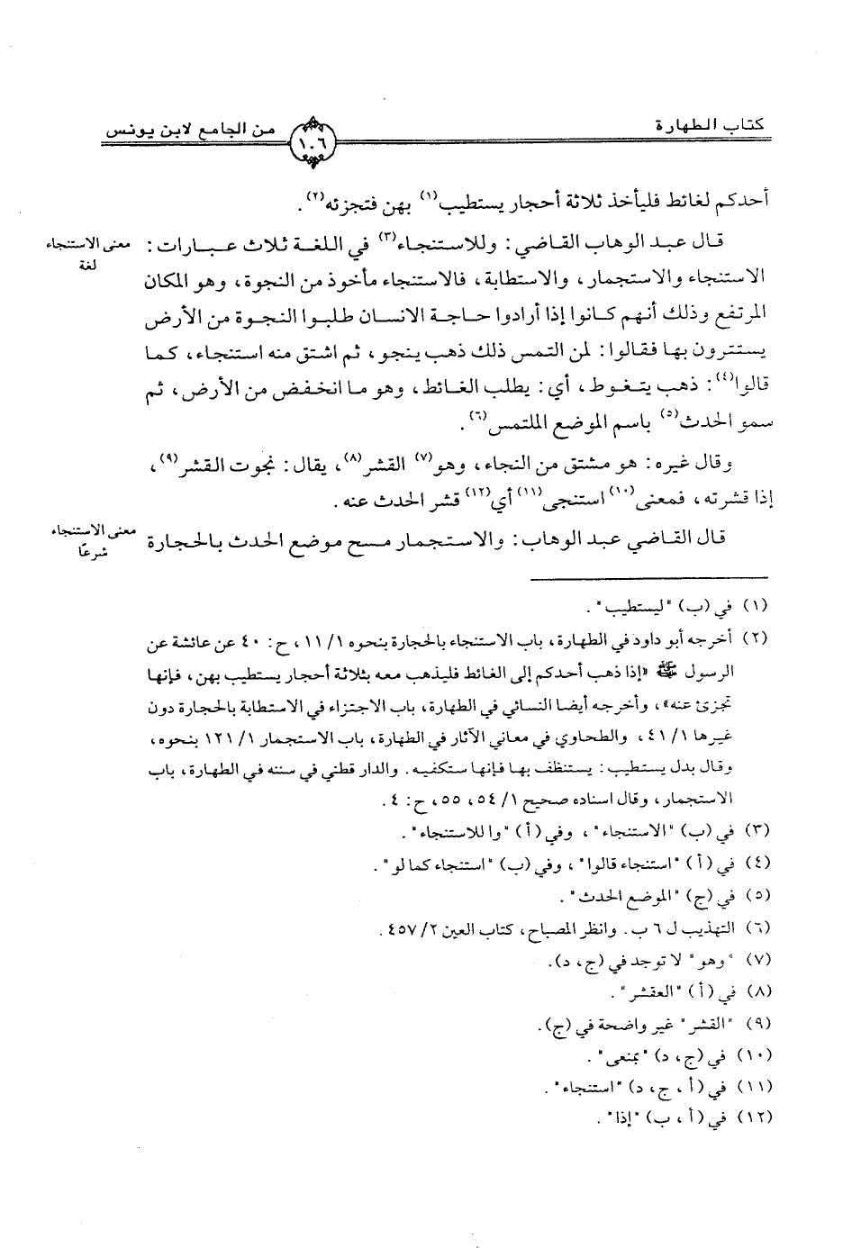 قال عبد الوهاب القاضي: وللاستنجاء في اللغة ثلاث عبارات: الاستنجاء والاستجمار, والاستطابة, فالاستنجاء مأخوذ من النجوة, وهو المكان المرتفع وذلك أنهم كانوا إذا أرادوا حاجة الانسان طلبوا النجوة من الأرض يستترون بها فقالوا: لمن التمس ذلك ذهب ينجو, ثم اشتق منه استنجاء, كما قالوا: ذهب يتغوط, أي: يطلب الغائط, وهو ما انخفض من الأرض, ثم سمو الحدث باسم الموضع الملتمس.
