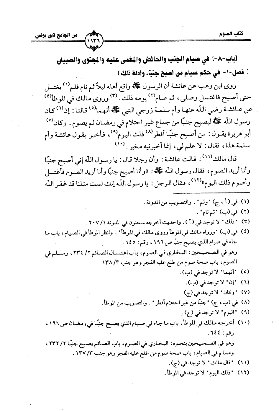 قال مالك: قالت عائشة: وأن رجلا قال: يا رسول الله إني أصبح جنبًا وأنا أريد الصوم، فقال رسول الله صلى الله عليه وسلم: ((وأنا أصبح جنبًا وأنا أريد الصوم فأغتسل وأصوم ذلك اليوم))، فقال الرجل: يا رسول الله إنك لست مثلنا قد غفر الله