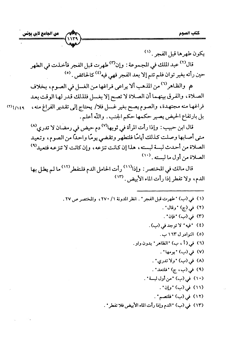 قال عبد الملك في المجموعة: وإن طهرت قبل الفجر فأخذت في الطهر حين رأته بغير توان فلم تتم إلا بعد الفجر فهي فيه كالحائض.