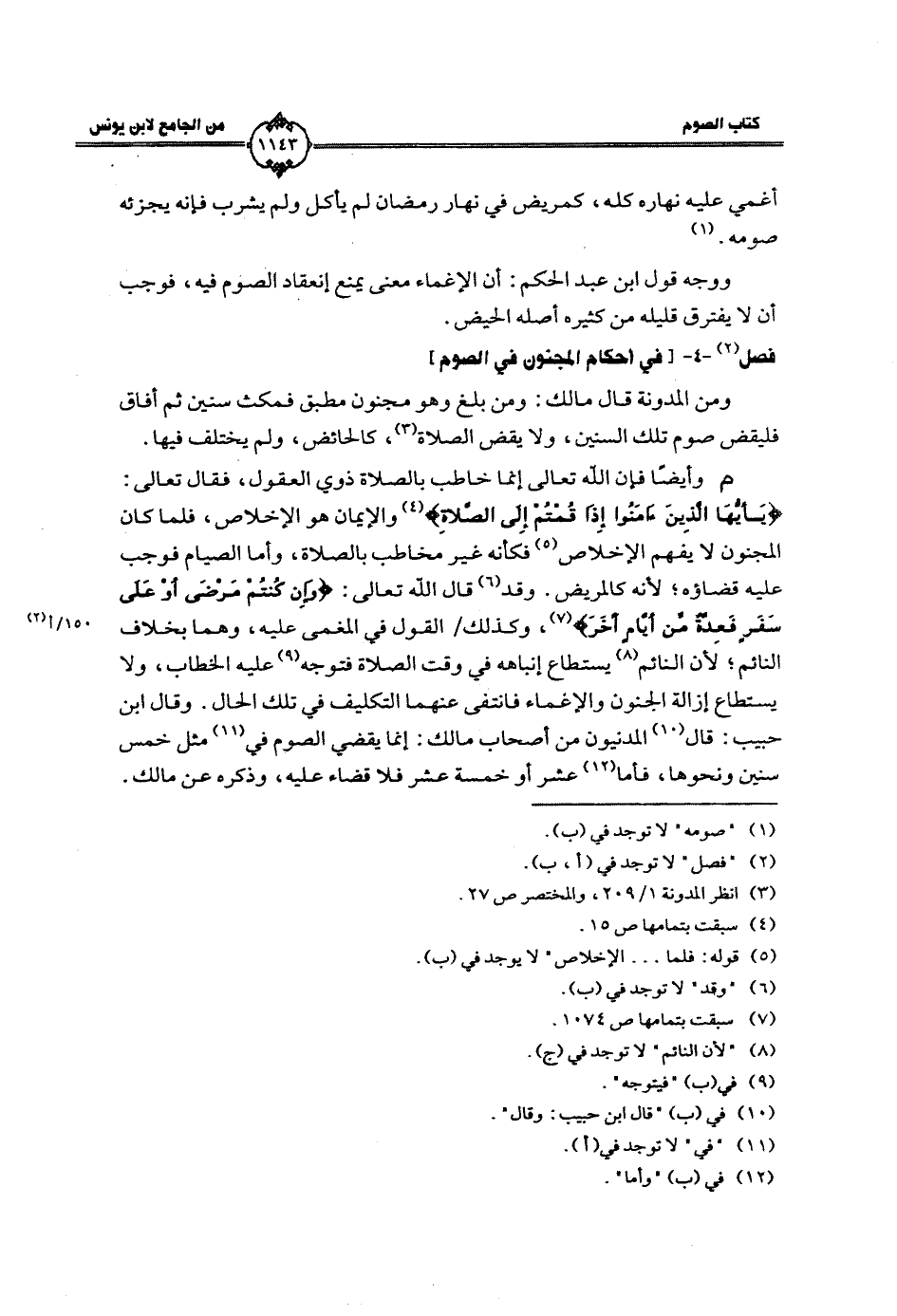م وأيضًا فإن الله تعالى إنما خاطب بالصلاة ذوي العقول، فقال تعالي: {يَا أَيُّهَا الَّذِينَ آمَنُوا إِذَا قُمْتُمْ إِلَى الصَّلاةِ} والإيمان هو الإخلاص، فلما كان المجنون لا يفهم الإخلاص فكأنه غير مخاطب بالصلاة، وأما الصيام فوجب عليه قضاؤه؛ لأنه كالمريض. وقد قال الله تعالى: {وَمَنْ كَانَ مَرِيضًا أَوْ عَلَى سَفَرٍ فَعِدَّةٌ مِنْ أَيَّامٍ أُخَرَ}، وكذلك/ القول في المغمى عليه، وهما بخلاف النائم؛ لأن النائم يستطاع إنباهه في وقت الصلاة فتوجه عليه الخطاب، ولا يستطاع إزالة الجنون والإغماء فانتفى عنهما التكليف في تلك الحال. وقال ابن حبيب: قال المدنيون من أصحاب مالك: إنما يقضي الصوم في مثل خمس سنين ونحوها، فأما عشر أو خمس عشر فلا قضاء عليه، وذكره عن مالك.