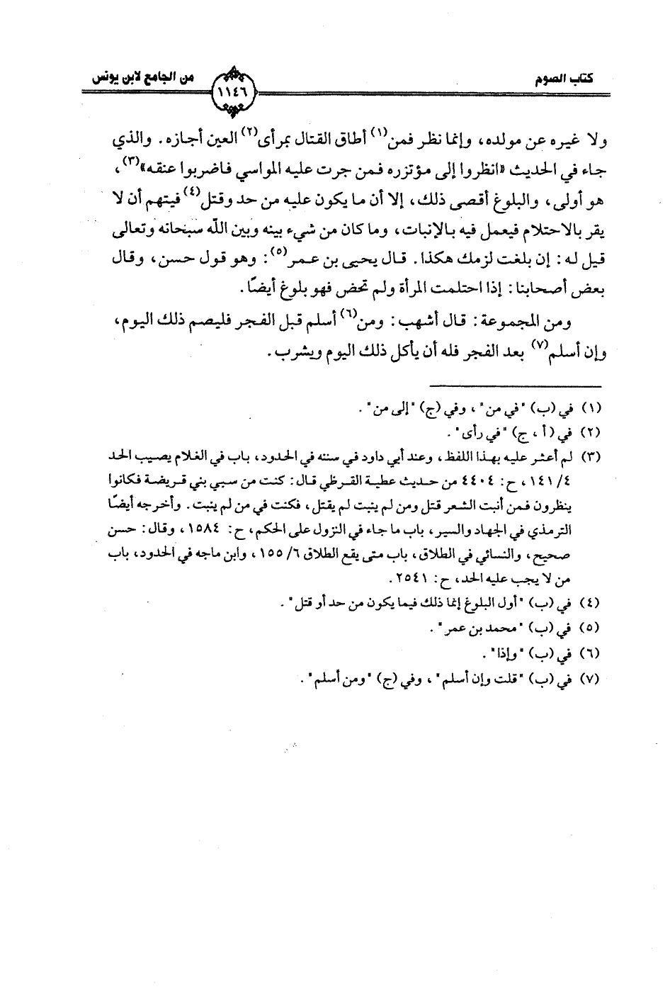 ولا غيره عن مولده، وإنما نظر فمن أطاق القتال بمرأى العين أجازه. والذي جاء في الحديث ((انظروا إلى مؤتزره فمن جرت عليه المواسي فاضربوا عنقه))، هو أولى، والبلوغ أقصى ذلك، إلا أن ما يكون عليه من حد وقتل فيتهم أن لا يقر بالاحتلام فيعمل فيه بالإنبات، وما كان من شيء بينه وبين الله سبحانه وتعالى قيل له: إن بلغت لزمك هكذا. قال يحيى بن عمر: وهو قول حسن، وقال بعض أصحابنا: إذا احتلمت المرأة ولم تحض فهو بلوغ أيضًا.