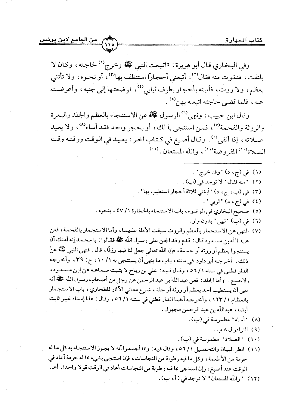 وقال ابن حبيب: ونهي الرسول - صلى الله عليه وسلم - عن الاستنجاء بالعظم والجلد والبعرة والروثة والفحمة, فمن استنجي بذلك, أو بحجر واحد فقد أساء, ولا يعيد صلاته, إذا أنقى. وقال أصبغ في كتاب آخر: يعيد في الوقت ووقته وقت الصلاة المفروض, والله المستعان