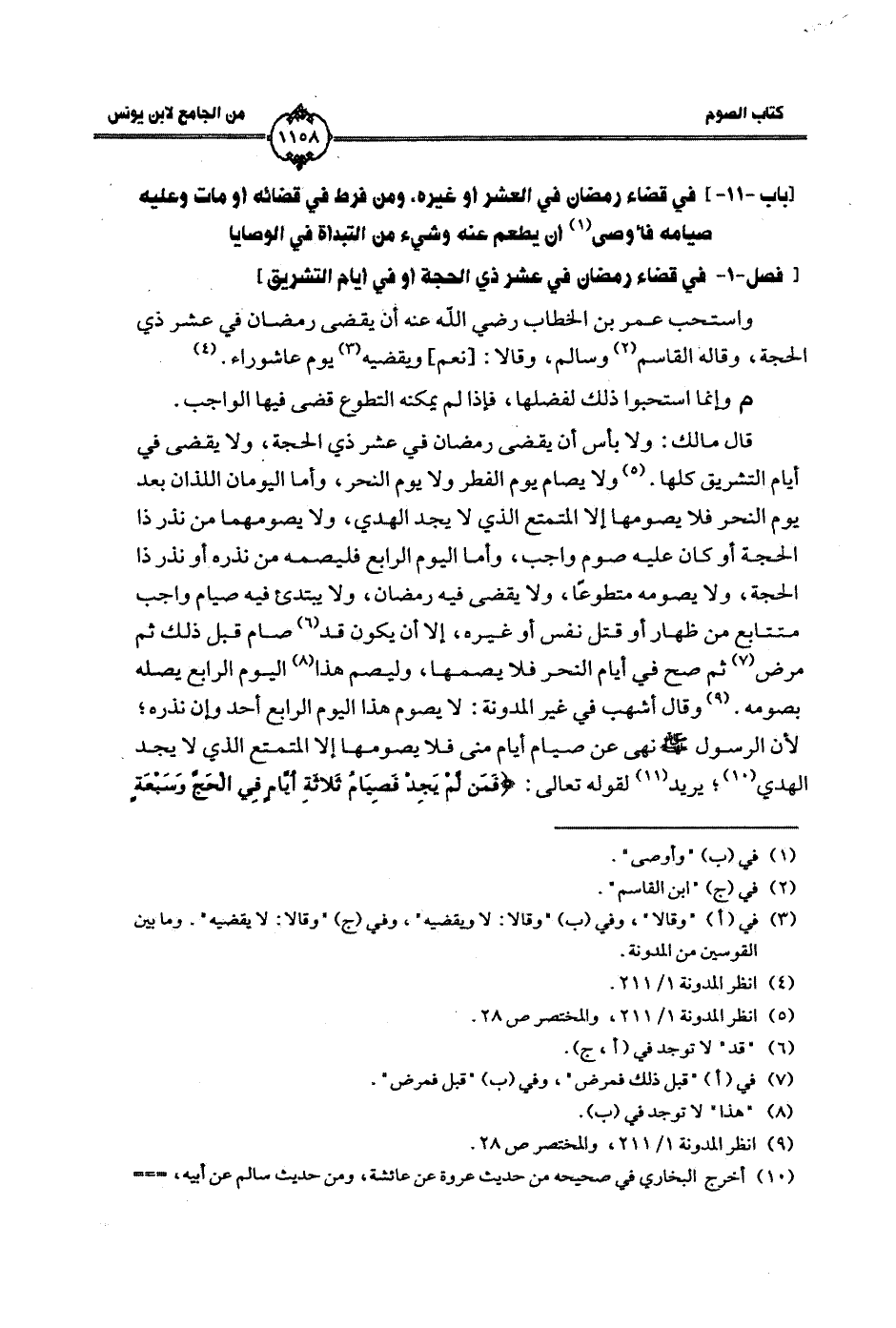 قال مالك: ولا بأس أن يقضي رمضان في عشر ذي الحجة، ولا يقضي في أيام التشريق كلها. ولا يصام يوم الفطر ولا يوم النحر، وأما اليومان اللذان بعد يوم النحر فلا يصومها إلا المتمتع الذي لا يجد الهدي، ولا يصومهما من نذر ذا الحجة أو كان عليه صوم واجب، وأما اليوم الرابع فليصمه من نذره أو نذر ذا الحجة، ولا يصومه متطوعًا، ولا يقضي فيه رمضان، ولا يبتدئ فيه صيام واجب متتابع من ظهار أو قتل نفس أو غيره، إلا أن يكون قد صام قبل ذلك ثم مرض ثم صح في أيام النحر فلا يصمها، وليصم هذا اليوم الرابع يصله بصومه. وقال أشهب في غير المدونة: لا يصوم هذا اليوم الرابع أحد وإن نذره؛ لأن الرسول صلى الله عليه وسلم نهى عن صيام أيام منى فلا يصومها إلا المتمتع الذي لا يجد الهدي؛ يريد لقوله تعالى: {فَمَنْ لَمْ يَجِدْ فَصِيَامُ ثَلاثَةِ أَيَّامٍ فِي الْحَجِّ وَسَبْعَةٍ