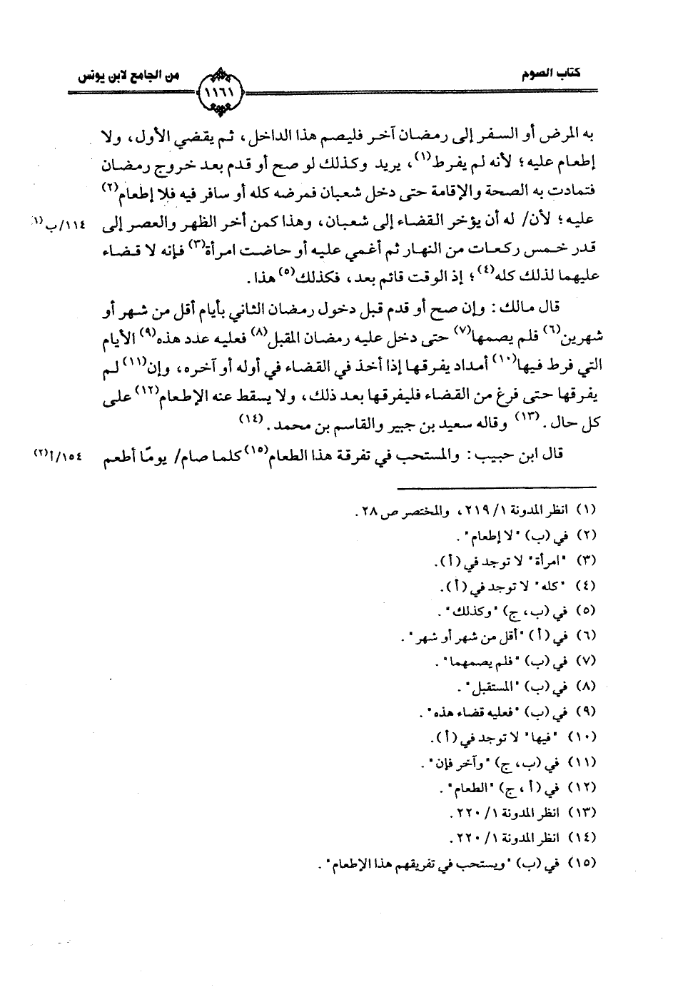 به المرض أو السفر إلى رمضان آخر فليصم هذا الدخل، ثم يقضي الأول، ولا إطعام عليه؛ لأنه لم يفرط، يريد وكذلك لو صح أو قدم بعد خروج رمضان فتمادت به الصحة والإقامة حتى دخل شعبان فمرضه كله أو سافر فيه فلا إطعام عليه؛ لأن/ له أن يؤخر القضاء إلى شعبان، وهذا كمن أخر الظهر والعصر إلى قدر خمس ركعات من النهار ثم أغمي عليه أو حاضت امرأة فإنه لا قضاء عليهما لذلك كله؛ إذ الوقت قائم بعد، فكذلك هذا.
