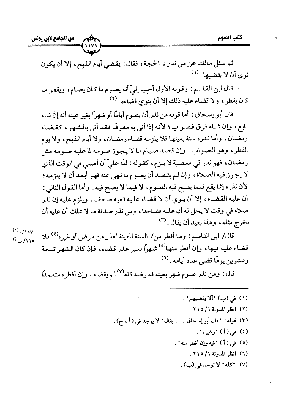 قال أبو إسحاق: أما قوله من نذر أن يصوم أياماً أو شهراً بغير عينه أنه إن شاء تابع، وإن شاء فرق فصواب؛ لأنه إذا أتى به مفرقاً فقد أتى بالشهر، كقضاء رمضان. وأما نذره سنة بعينها فلا يلزمه قضاء رمضان، ولا أيام الذبح، ولا يوم الفطر، وهو الصواب. وإن قصد صيام ما لا يجوز صومه لما عليه صومه مثل رمضان، فهو نذر في معصية لا يلزم، كقوله: لله عليّ أن أصلي في الوقت الذي لا يجوز فيه الصلاة، وإن لم يقصد أن يصوم ما نهى عنه فهو أبعد أن لا يلزمه؛ لأن نذره إنما يقع فيما يصح فيه الصوم، لا فيما لا يصح فيه. وأما القول الثاني: أن عليه القضاء، إلا أن ينوي أن لا قضاء عليه ففيه ضعف، ويلزم عليه إن نذر صلاة في وقت لا يحل له أن عليه قضاءها، ومن نذر صدقة ما لا يملك أن عليه أن يخرج مثله، وهذا بعيد أن يقال.