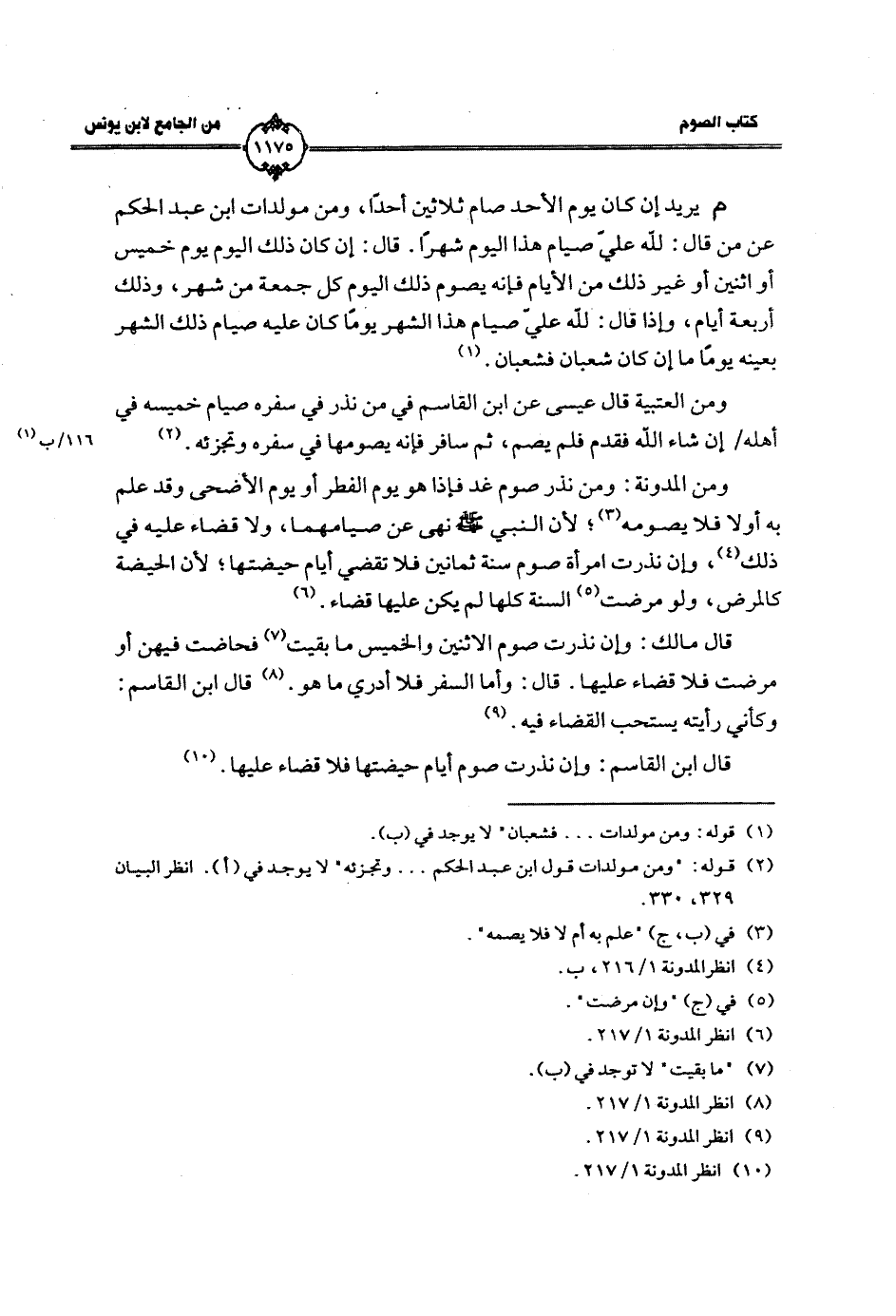 م يريد إن كان يوم الأحد صام ثلاثين أحداً، ومن مولدات ابن عبد الحكم عن من قال: لله عليّ صيام هذا اليوم شهراً. قال: إن كان ذلك اليوم يوم خميس أو اثنين أو غير ذلك من الأيام فإنه يصوم ذلك اليوم كل جمعة من شهر، وذلك أربعة أيام، وإذا قال: لله عليّ صيام هذا الشهر يوماً كان عليه صيام ذلك الشهر بعينه يوماً ما إن كن شعبان فشعبان.