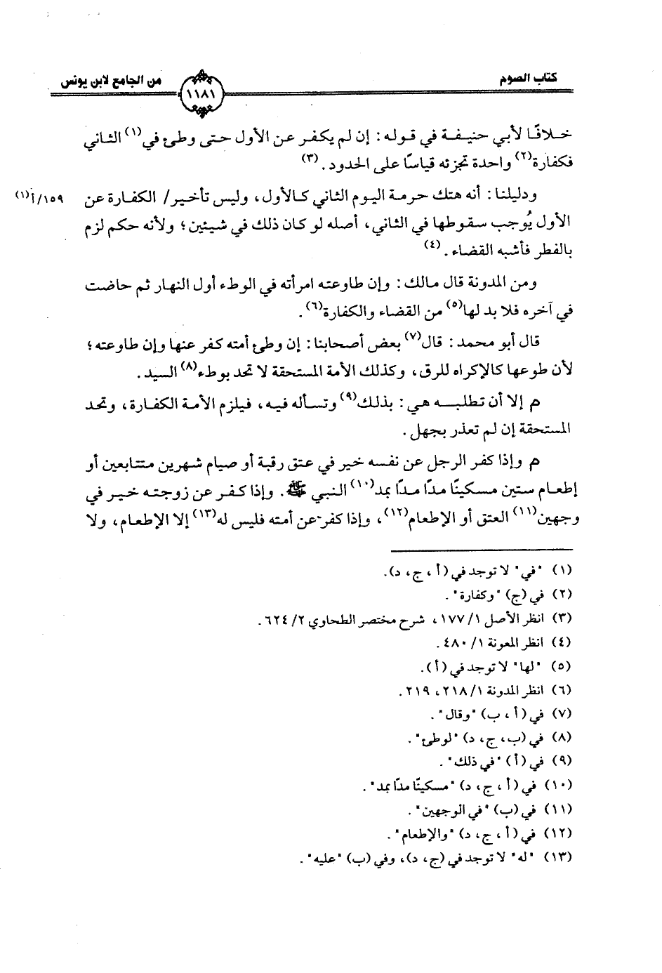م وإذا كفر الرجل عن نفسه خير في عتق رقبة أو صيام شهرين متتابعين أو إطعام ستين مسكينًا مدًا مدًا بمد النبي صلى الله عليه وسلم. وإذا كفر عن زوجته خير في وجهين العتق أو الإطعام، وإذا كفر عن أمته فليس له إلا الإطعام، ولا