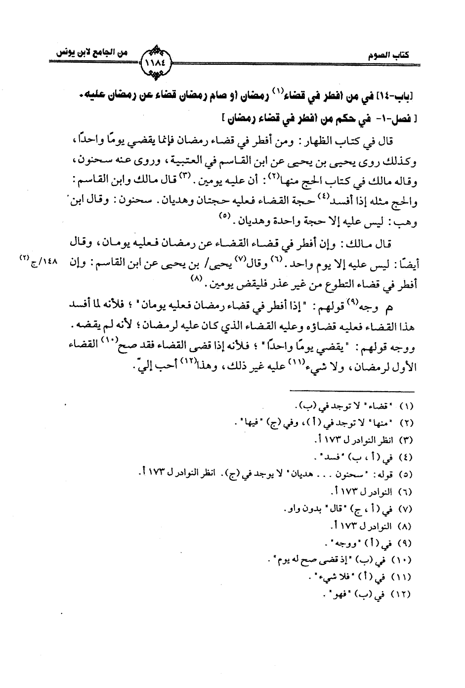 م وجه قولهم: ((إذا أفطر في قضاء رمضان فعليه يومان))؛ فلأنه لما أفسد هذا القضاء فعليه قضاؤه وعليه القضاء الذي كان عليه رمضان؛ لأنه لم يقضه. ووجه قولهم: ((يقضي يومًا واحدًا؛ فلأنه إذا قضى القضاء فقد صح القضاء الأول لرمضان، ولا شيء عليه غير ذلك، وهذا أحب إلي.