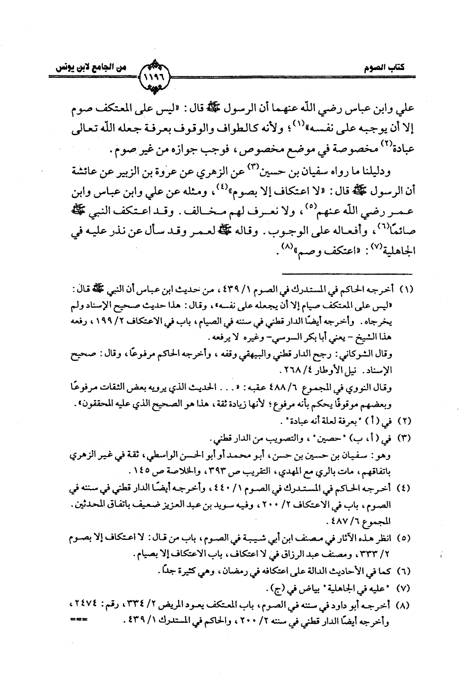 ودليلنا ما رواه سفيان بن حسين عن الزهري عن عروة بن الزبير عن عائشة أن الرسول صلى الله عليه وسلم قال: ((لا اعتكاف إلا بصوم))، ومثله عن علي وابن عباس وابن عمر رضي الله عنهم، ولا نعرف لهم مخالف. وقد اعتكف النبي صلى الله عليه وسلم صائمًا، وأفعاله على الوجوب. وقاله صلى الله عليه وسلم لعمر وقد سأل عن نذر عليه في الجاهلية: ((اعتكف وصم)).