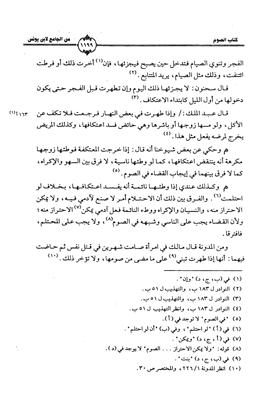 م وكذلك عندي إذا وطئها نائمة أنه يفسد اعتكافها، بخلاف لو احتلمت. والفرق بين ذلك أن الاحتلام أمر لا صنع لآدمي فيه، ولا يمكن الاحتراز منه، والنسيان والإكراه ووطء النائمة فعل آدمي يمكن الاحتراز منه؛ ولأن القضاء يجب على الناسي وشبهه في الصوم، ولا يجب على المحتلم، فافترقا.