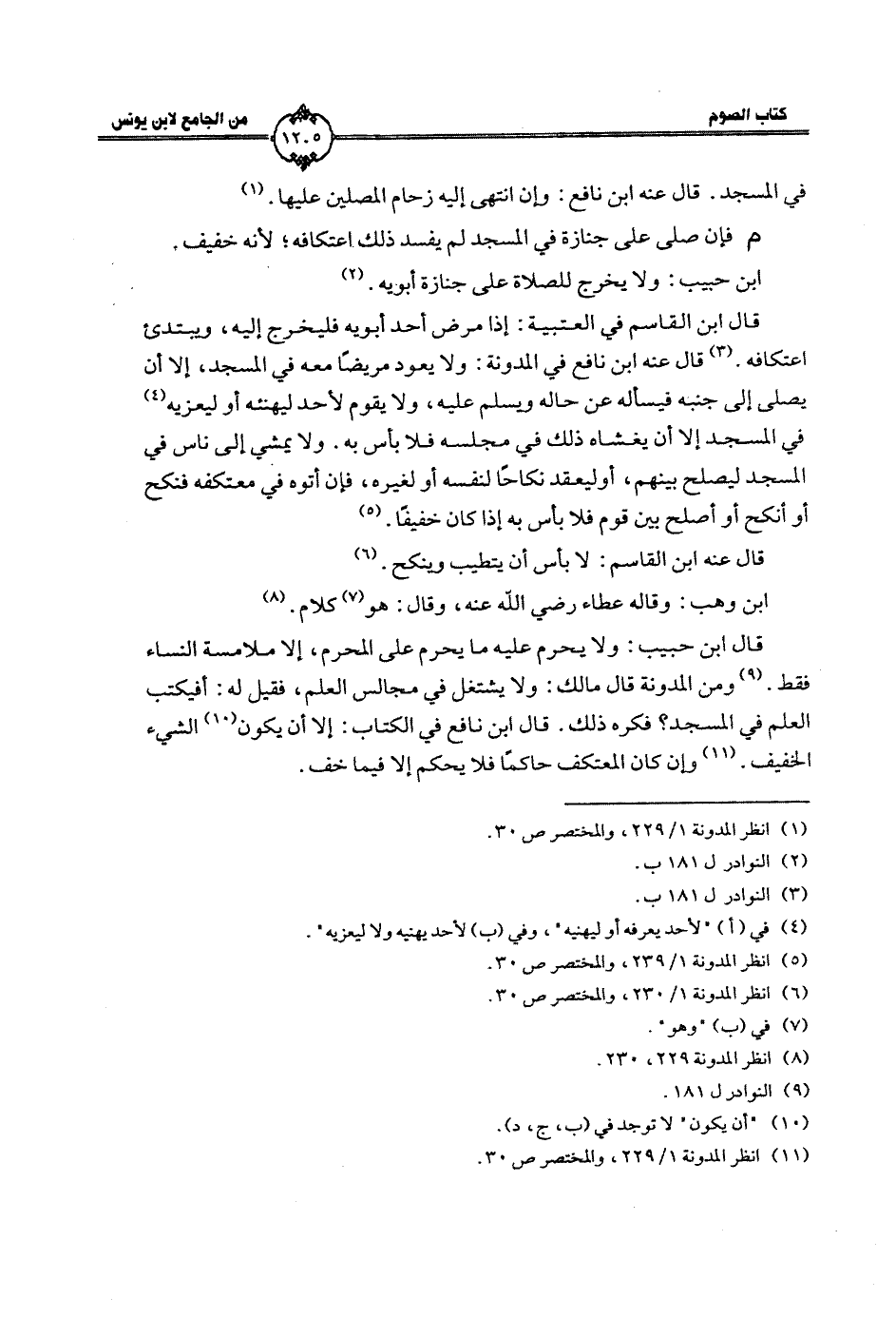 قال ابن القاسم في العتبية: إذا مرض أحد أبويه فليخرج إليه، ويبتدئ اعتكافه. قال عنه ابن نافع في المدونة: ولا يعود مريضًا معه في المسجد، إلا أن يصلى إلى جنبه فيسأله عن حاله ويسلم عليه، ولا يقوم لأحد ليهنئه أو ليعزيه في المسجد إلا أن يغشاه ذلك في مجلسه فلا بأس به. ولا يمشي إلى ناس في المسجد ليصلح بينهم، أو ليعقد نكاحًا لنفسه أو لغيره، فإن أتوه في معتكفه فنكح أو أنكح أو أصلح بين قوم فلا بأس به إذا كان خفيفًا.