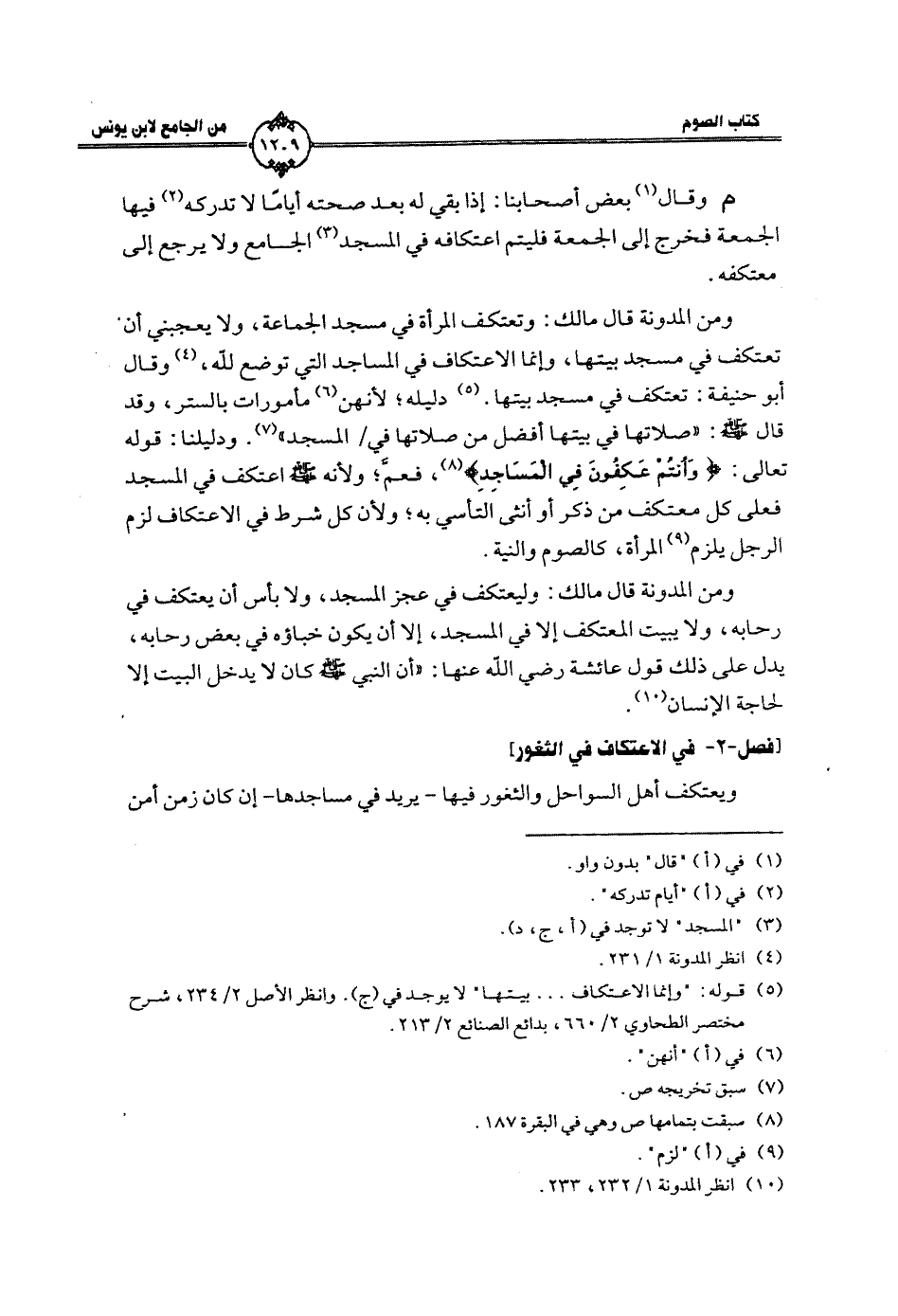 ومن «المدونة» قال مالك: وليعتكف في عجز المسجد، ولا بأس أن يعتكف في رحابه، ولا يبيت المعتكف إلا في المسجد، إلا أن يكون خباؤه في بعض رحابه، يدل على ذلك قول عائشة رضي الله عنها: «أن النبي صلى الله عليه وسلم كان لا يدخل البيت إلا لحاجة الإنسان».