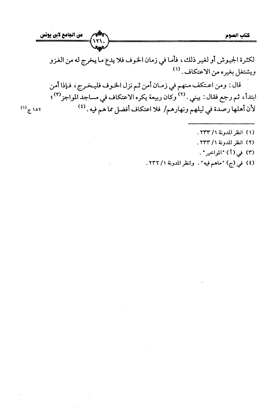 قال: ومن اعتكف منهم في زمان أمن ثم نزل الخوف فليخرج، فإذا أمن ابتدأ، ثم رجع فقال: يبني. وكان ربيعة يكره الاعتكاف في مساجد المواجز؛ لأن أهلها رصدة في ليلهم ونهارهم/ فلا اعتكاف أفضل مما هم فيه.