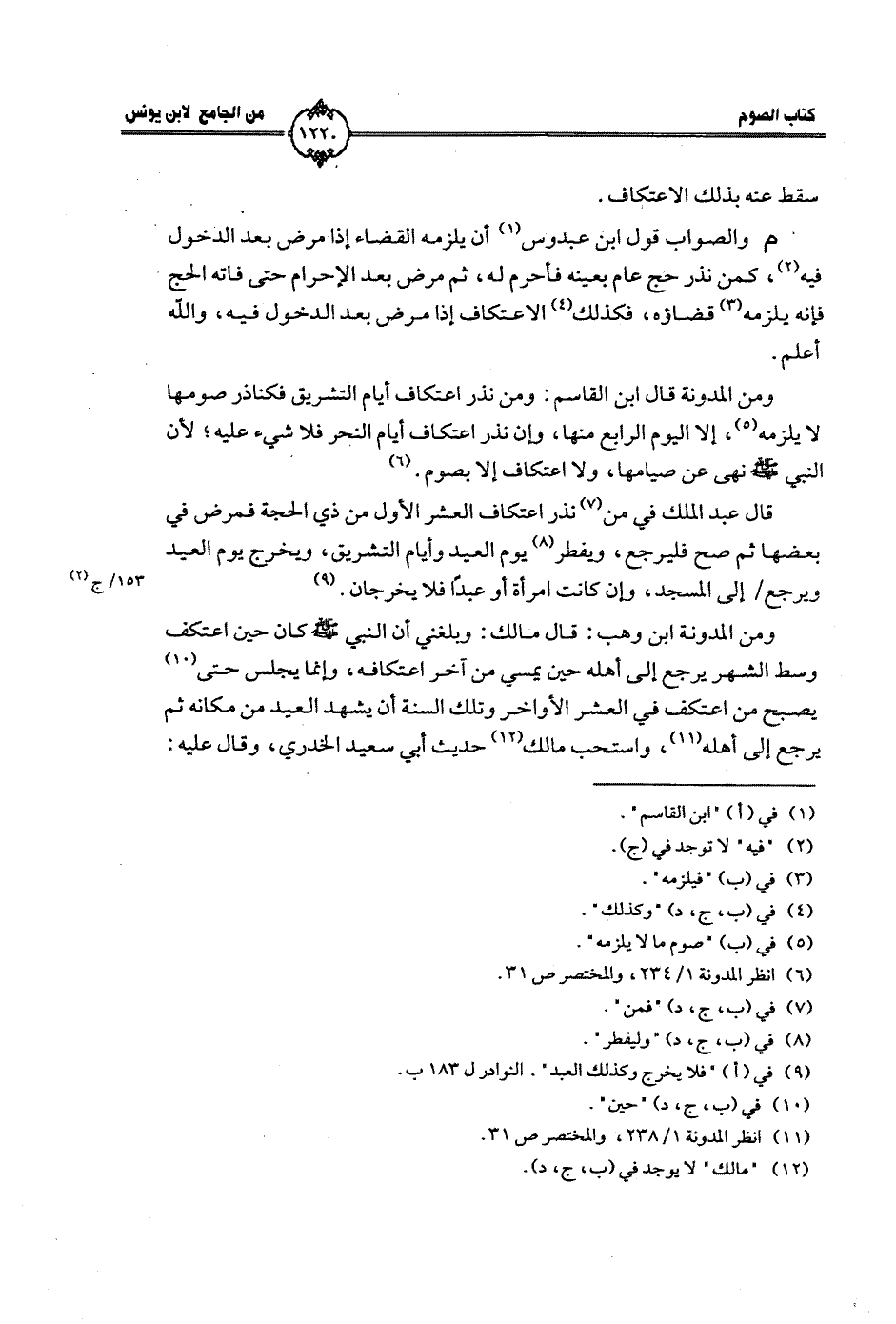 ومن «المدونة» قال ابن القاسم: ومن نذر اعتكاف أيام التشريق فكناذر صومها لا يلزمه، إلا اليوم الرابع منها، وإن نذر اعتكاف أيام النحر فلا شيء عليه؛ لأن النبي صلى الله عليه وسلم نهى عن صيامها، ولا اعتكاف إلا بصوم.