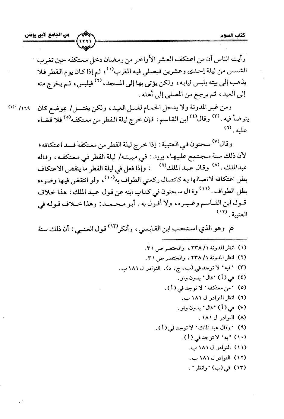 وقال سحنون في «العتبية»: إذا خرج ليلة الفطر من معتكفه فسد اعتكافه؛ لأن ذلك سنة مجتمع عليها، يريد: في مبيته/ ليلة الفطر في معتكفه، وقاله عبد الملك. وقال عبد الملك: وإذا فعل في ليلة الفطر ما ينقض الاعتكاف بطل اعتكافه لاتصالها به كاتصال ركعتي الطواف به، ولو انتقض فيها وضوءه بطل الطواف. وقال سحنون في كتاب ابنه عن قول عبد الملك: هذا خلاف قول ابن القاسم وغيره، ولا أقول به. أبو محمد: وهذا خلاف قوله في «العتبية».