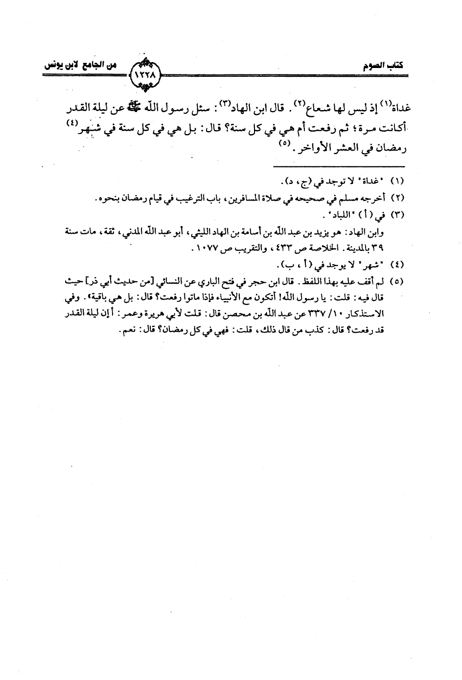 غداة إذ ليس لها شعاع. قال ابن الهاد: سئل رسول الله صلى الله عليه وسلم عن ليلة القدر أكانت مرة؛ ثم رفعت أم هي في كل سنة؟ قال: بل هي في كل سنة من شهر رمضان في العشر الأواخر.
