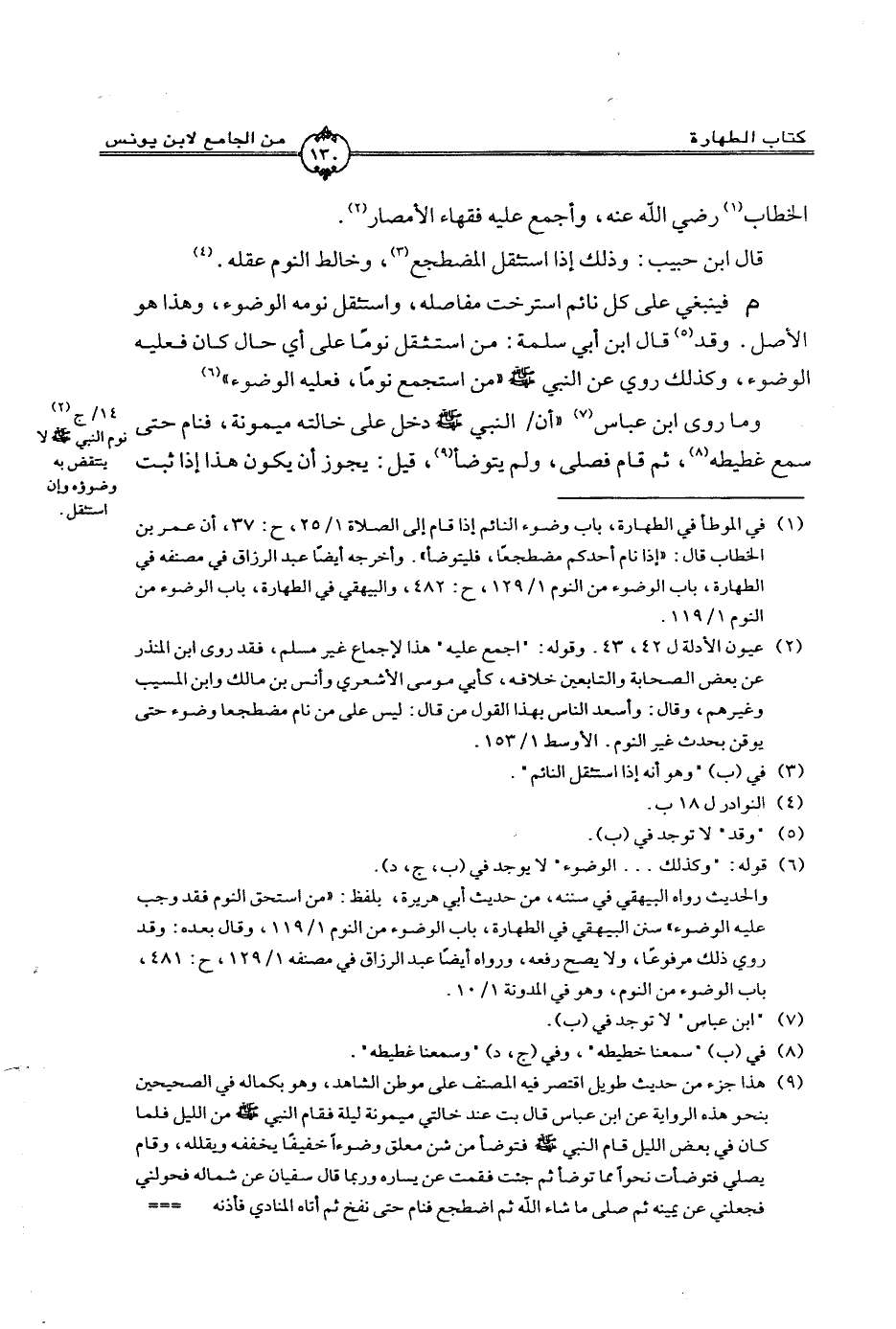م فينبغي على كل نائم استرخت مفاصله، واستثقل نومه الوضوء، وهذا هو الأصل. وقد قال ابن أبي سلمه: من استثقل نوماً على أي حال كان فعليه الوضوء، وكذلك روي عن النبي صلى الله عليه وسلم ((من استجمع نوماً، فعليه الوضوء))