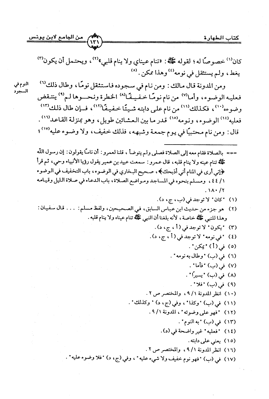 ومن المدونة قال مالك: ومن نام في سجوده فاستثقل نومًا، وطال ذلك فعليه الوضوء، وأما من نام نومًا خفيفًا الخطرة ونحوها لم ينتقض وضوءه، فكذلك من نام على دابته شيئًا خفيفًا، فإن طال ذلك فعليه الوضوء، ونومه قدر ما بين العشائين طويل، وهو بمنزلة القاعد. قال: ومن نام محتبيًا في يوم جمعة وشبهه، فذلك خفيف، ولا وضوء عليه؛